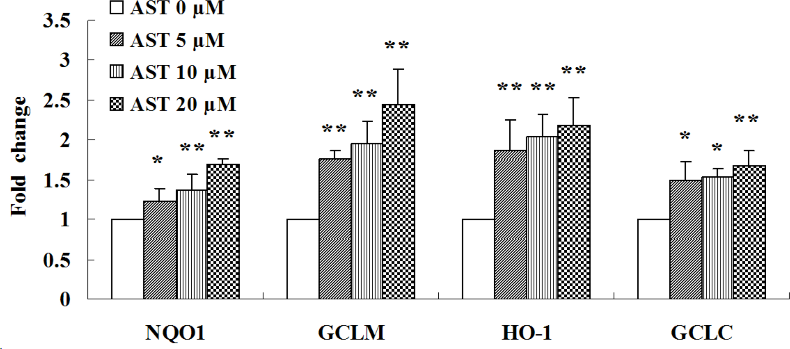 Figure 5. Astaxanthin increased expression of NQO1, GCLM, HO-1 and GCLC mRNA. Cells were treated with 5, 10, and 20 µM astaxanthin (AST)