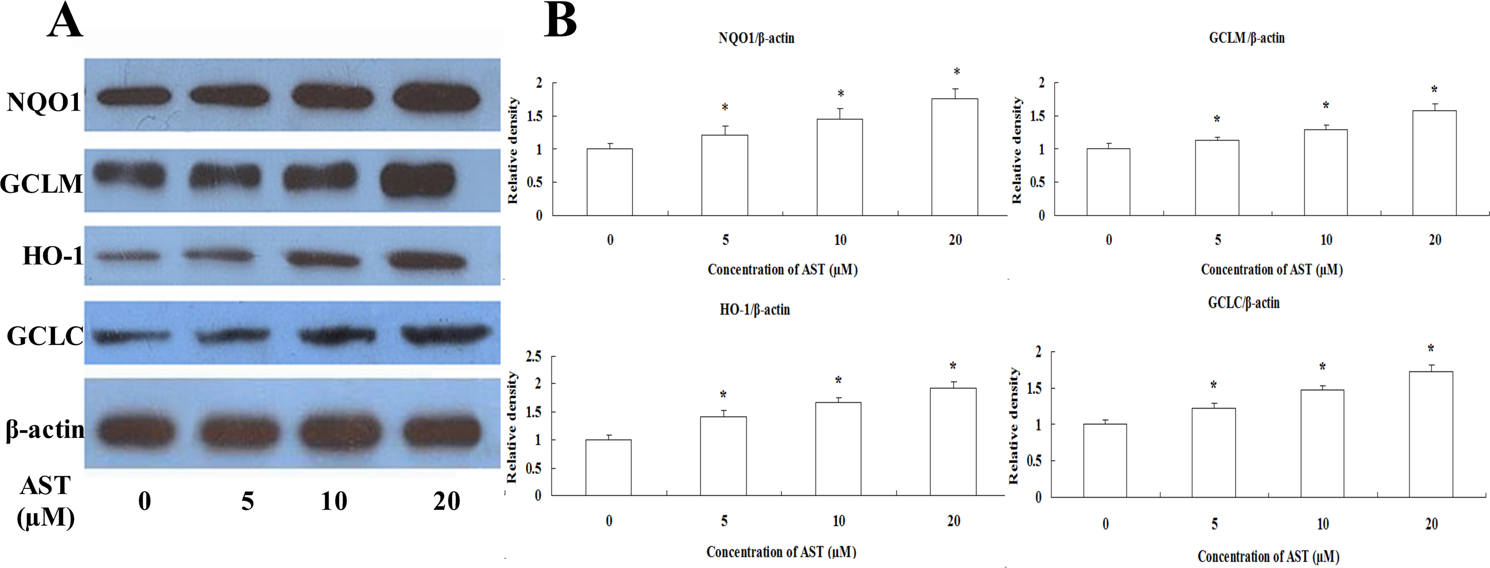 Figure 6. Astaxanthin increased expression of NQO1, GCLM, HO-1 and GCLC protein. A: Cells were treated with 5, 10, and 20 µM astaxanthin (AST) for 24 h. Western blot analysis was performed using the corresponding