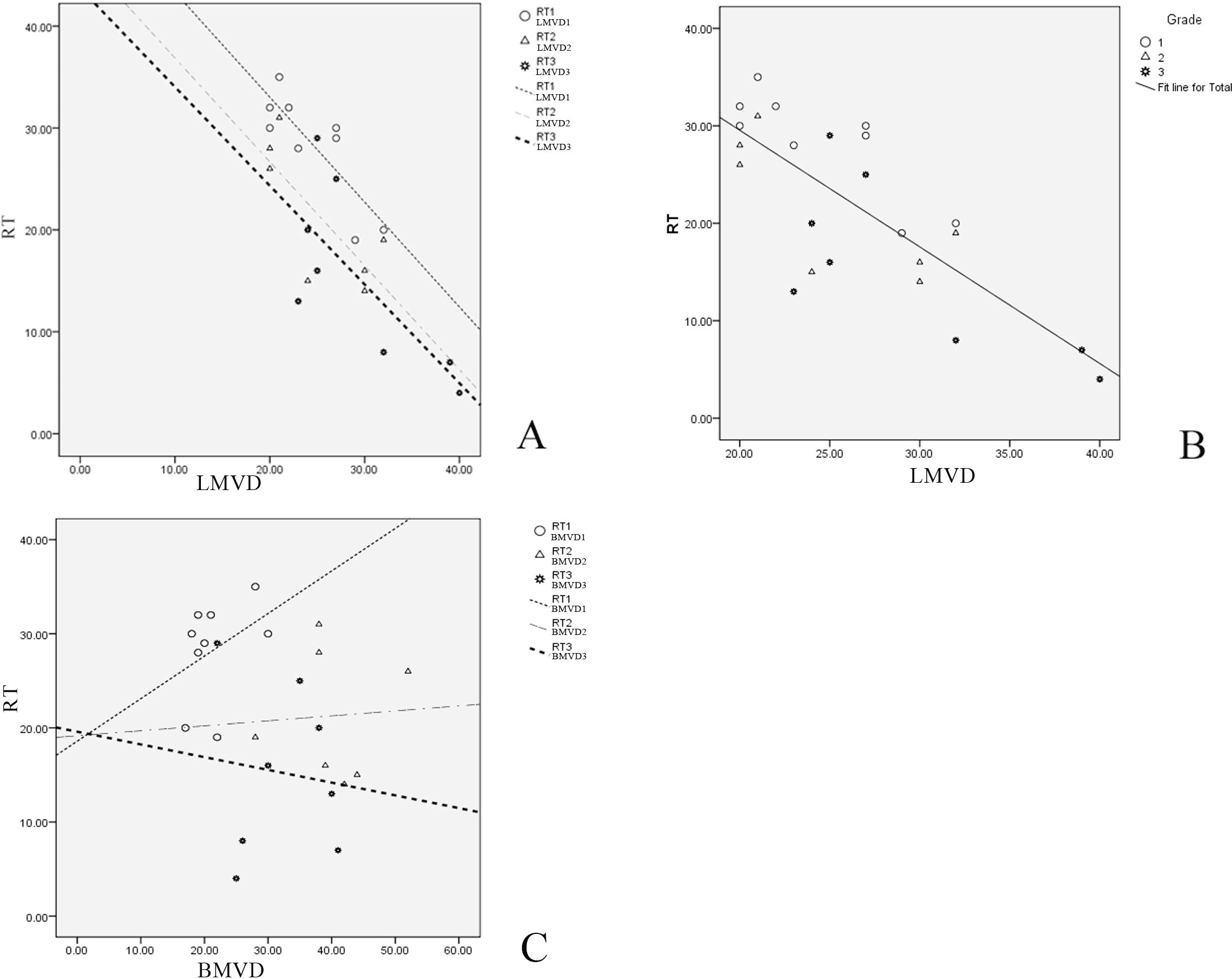 density (LMVD) in each grade. B: Scatter distribution of RT in all cases was with a fit line for total LMVD. C: Scatter distribution of RT in different grades of pterygium was with best fit lines for blood microvessel density (BMVD)