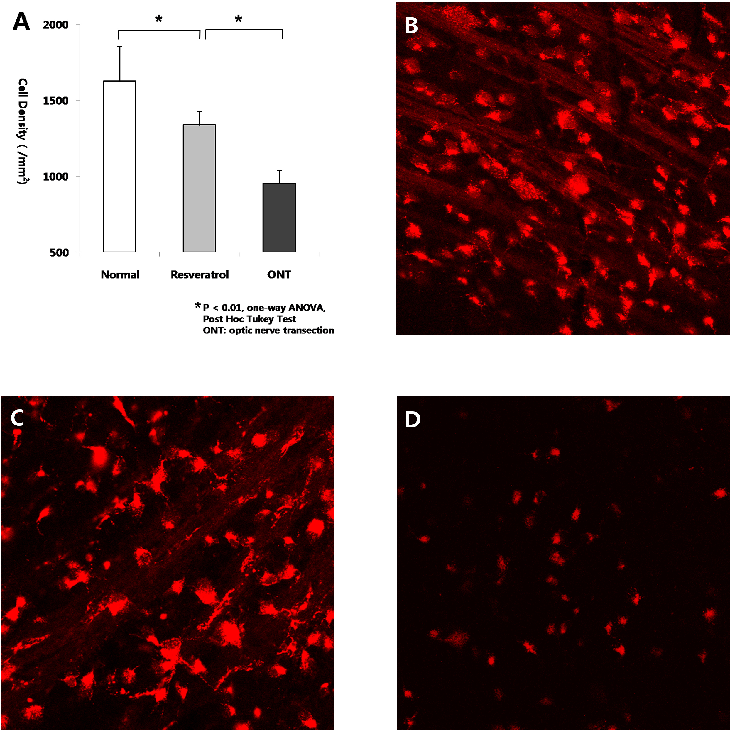 Figure 1. Analysis of neuroprotective effect of resveratrol at 1 week after optic nerve transection. A: The numbers of retinal ganglion cells (RGCs) of eyes treated with intravitreal injection of resveratrol (31.3 uM) in the