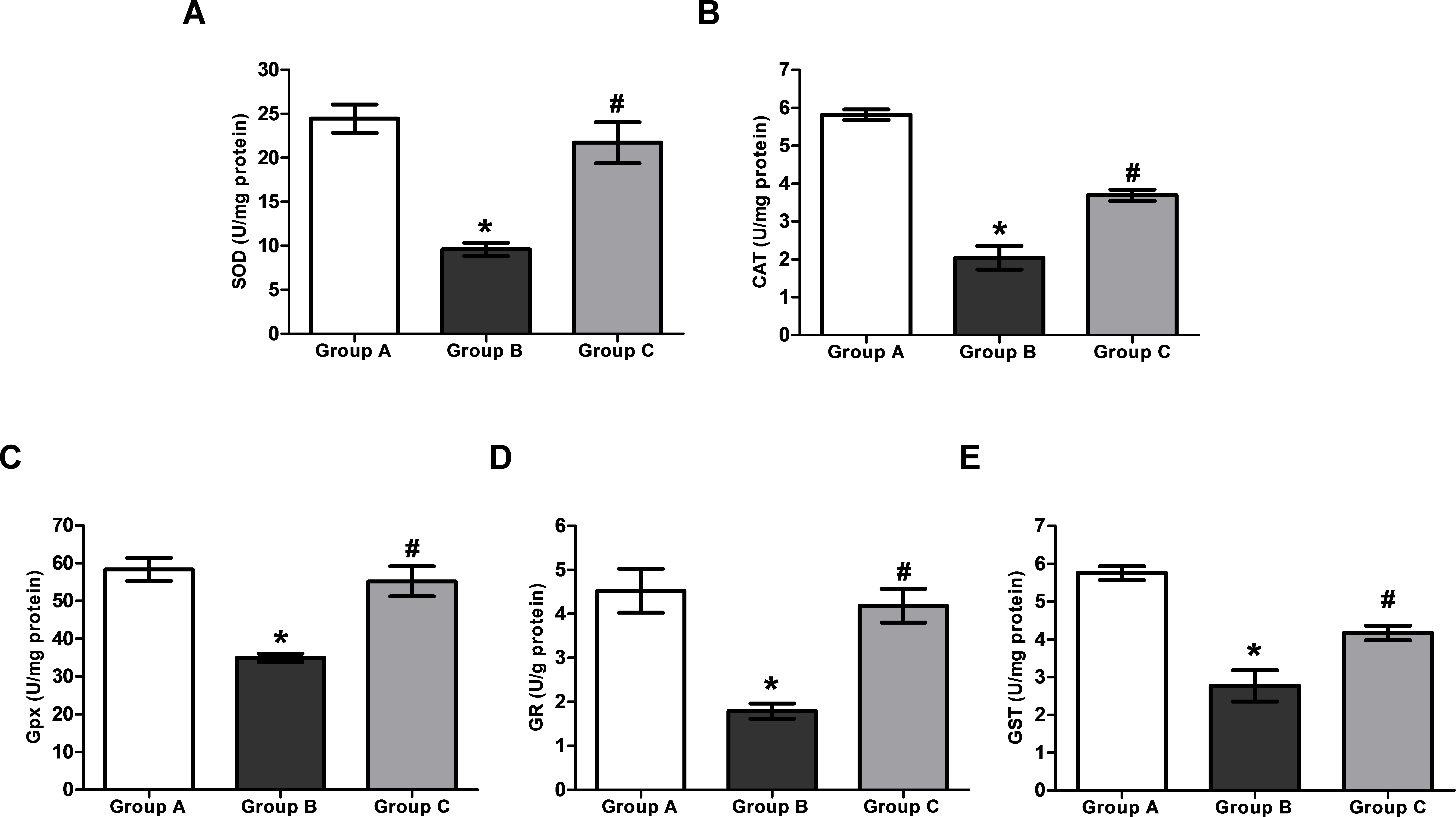 Figure 3. The activities of antioxidant enzymes in lenticular samples of the 26-day-old rat pups in various experimental groups. Group