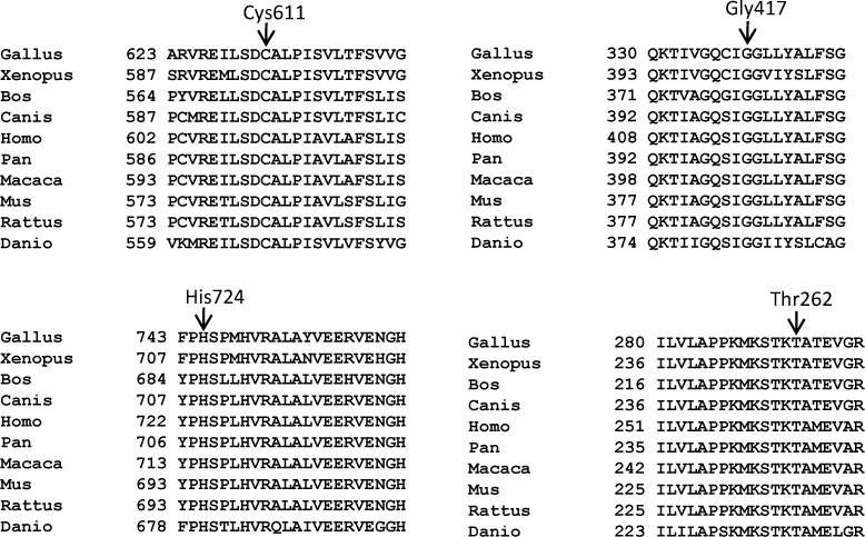 Cys611, Gly417, His724, and Thr262 across different species in SLC4A11. The number refers to the position of the amino acid