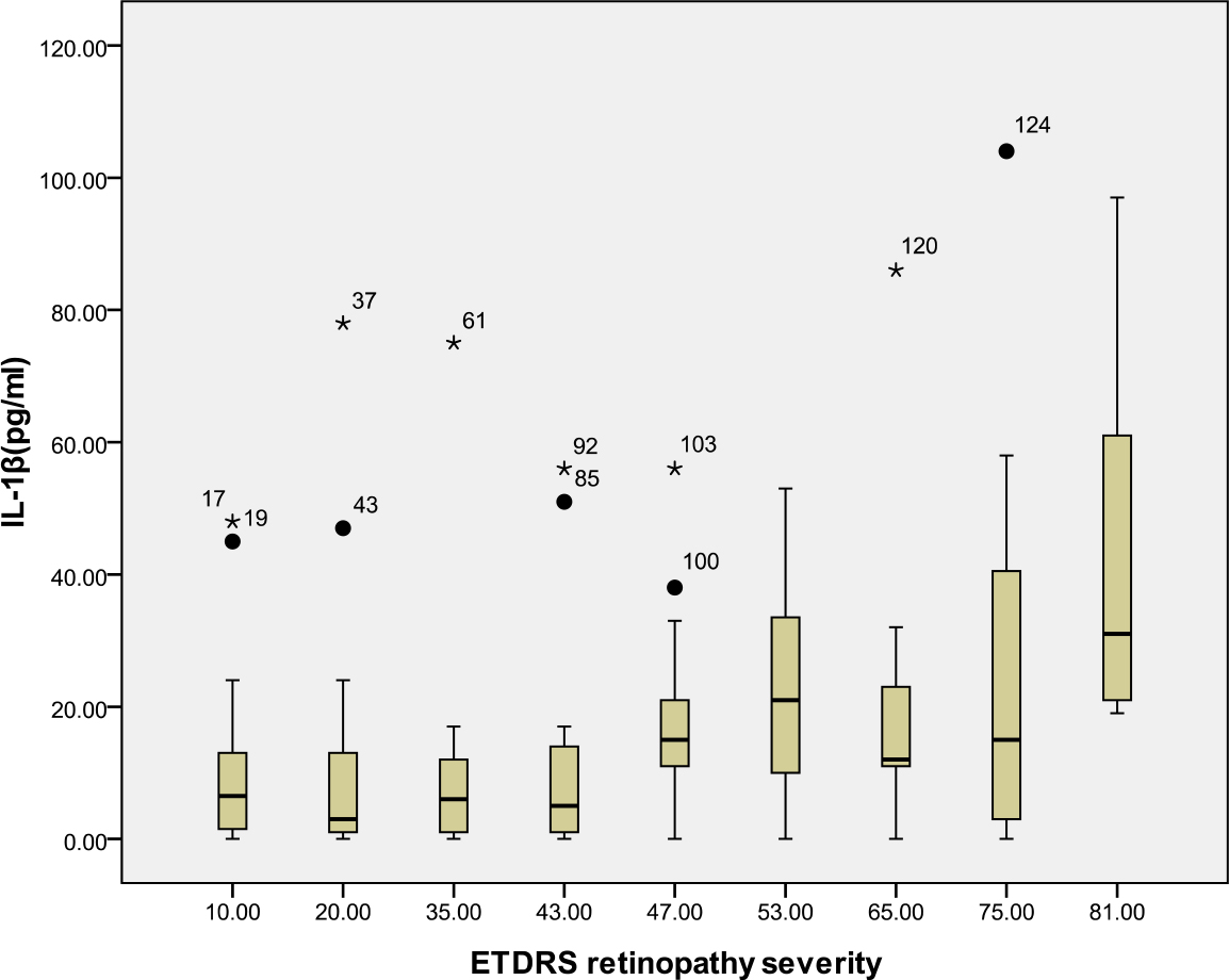 Figure 1. Relationship between the severity of diabetic retinopathy (DR) and the aqueous interleukin-1β level. The results by measuring