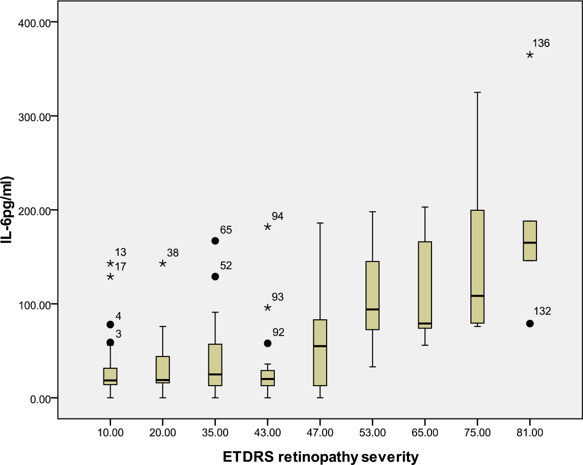 Figure 2. Relationship between the severity of diabetic retinopathy (DR) and the aqueous interleukin-6 (IL-6) level. The results by