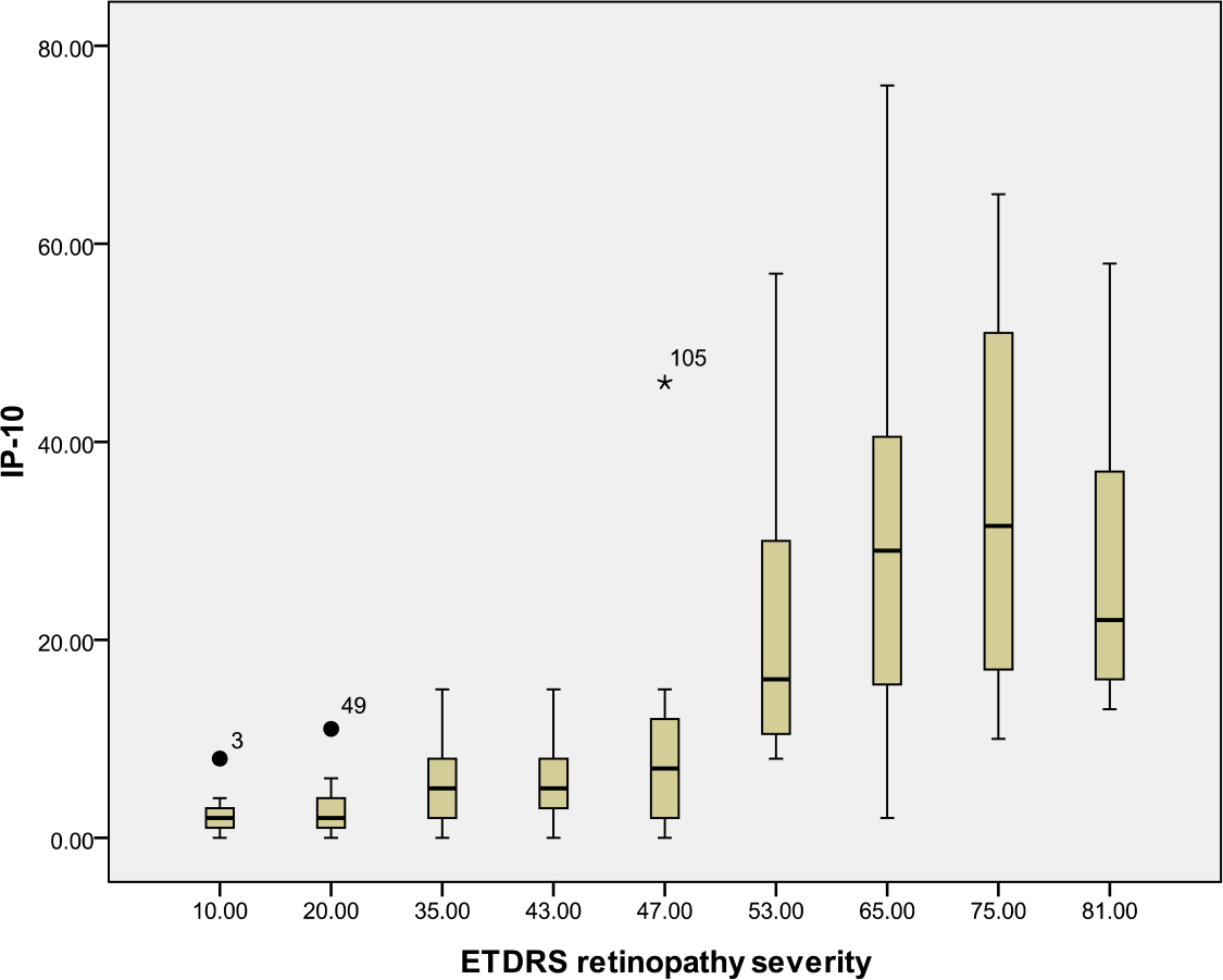 Figure 5. Relationship between the severity of diabetic retinopathy (DR) and the aqueous interferon gamma-induced protein-10 (IP-10)