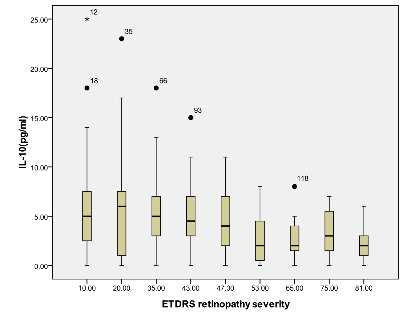 Figure 7. Relationship between the severity of diabetic retinopathy (DR) and the aqueous interleukin-10 (IL-10) level. The results by