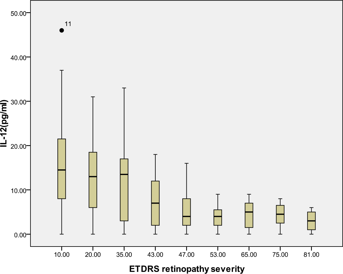 Figure 8. Relationship between the severity of diabetic retinopathy (DR) and the aqueous interleukin-12 (IL-12) level. The results by