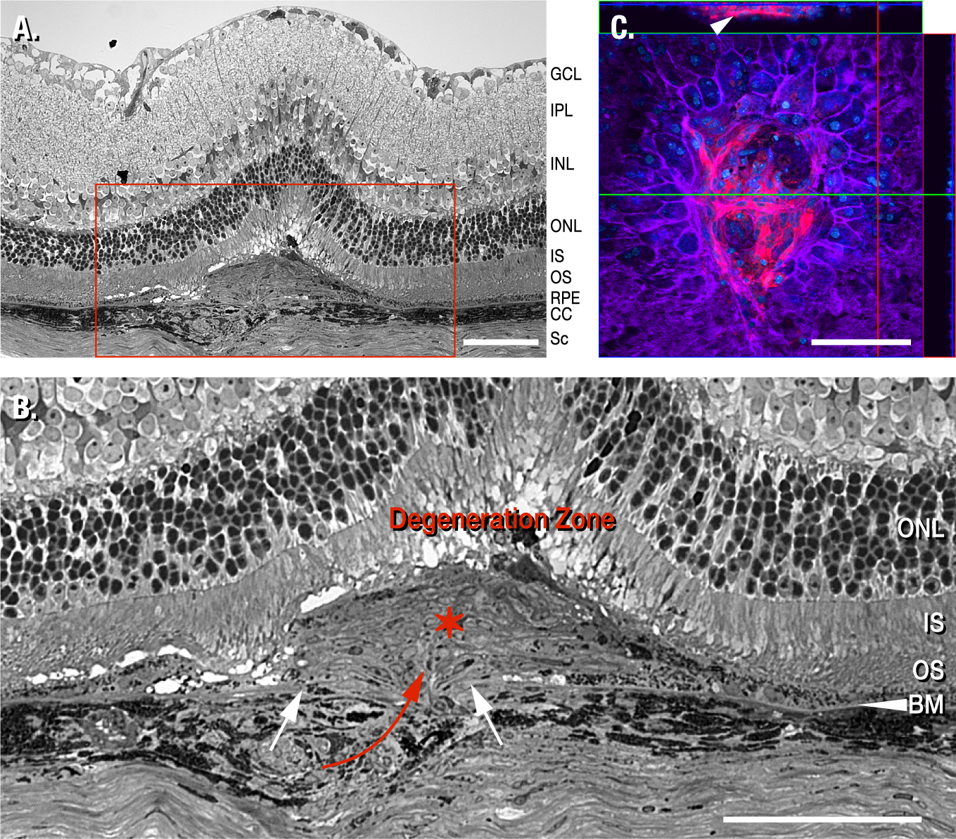 the photoreceptors. This mass (red asterisk) displaces the photoreceptors and triggers degeneration (Degeneration Zone). Vessels