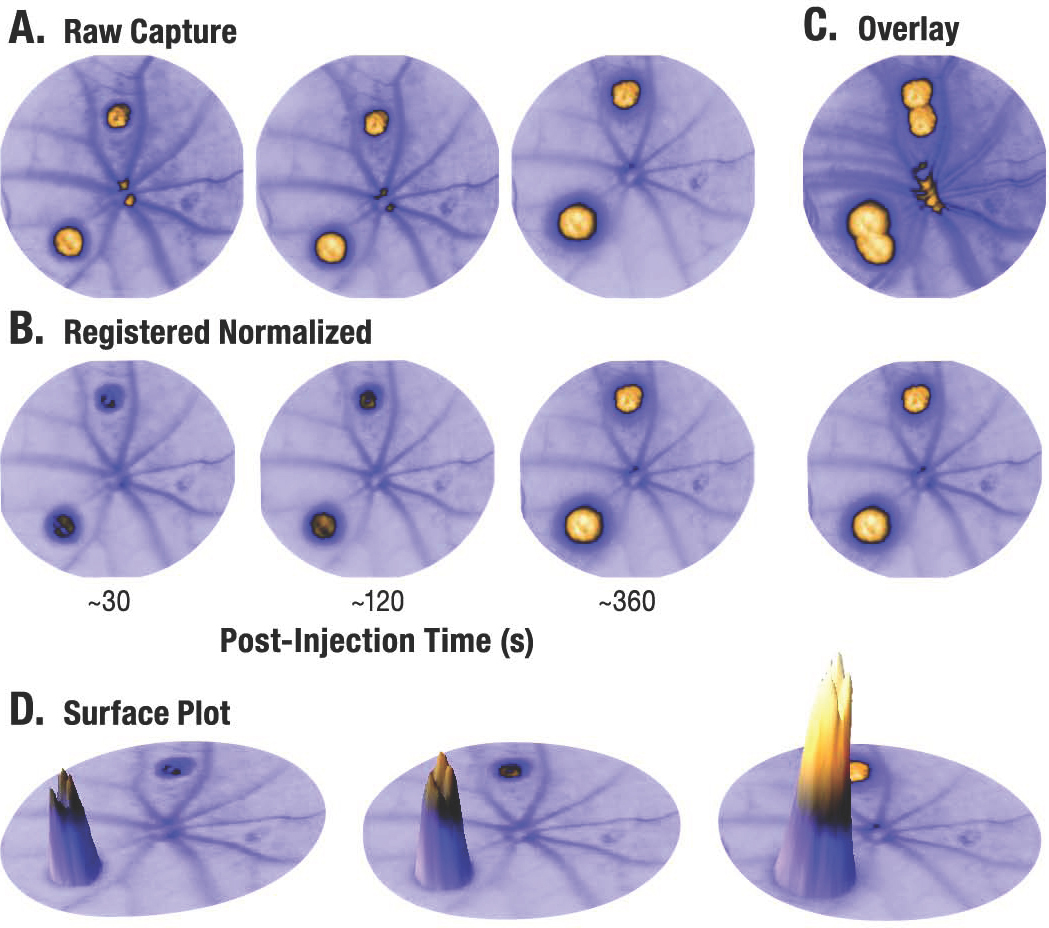 changes between phases. B: Registered and normalized angiograms reveal a clear time-dependent accumulation of fluorescein within lesions. Note that