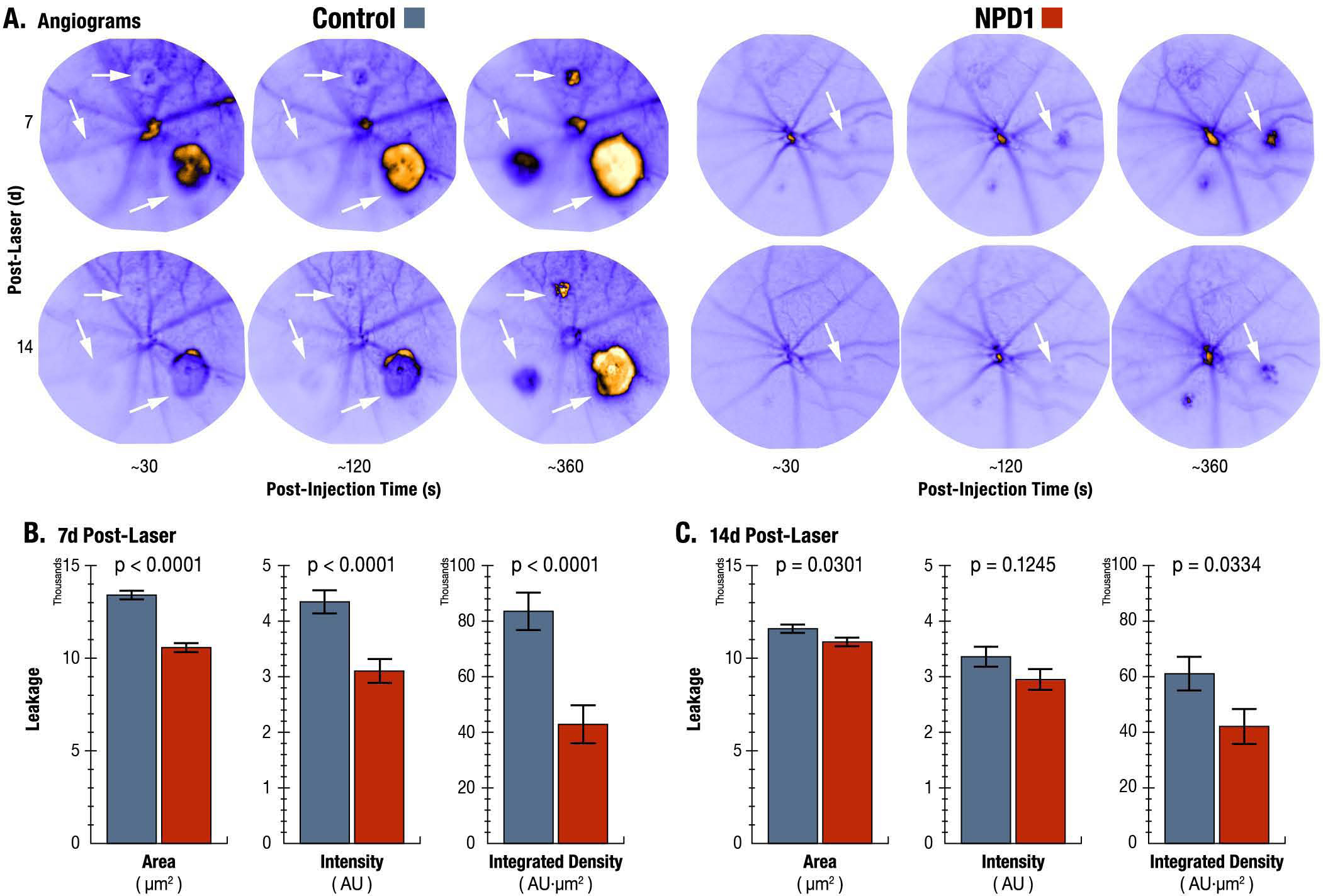 intensity, and integrated density of leakage. C: At 14 days post laser, 1 week after cessation of treatment, NPD1-induced reductions in leakage area and integrated density