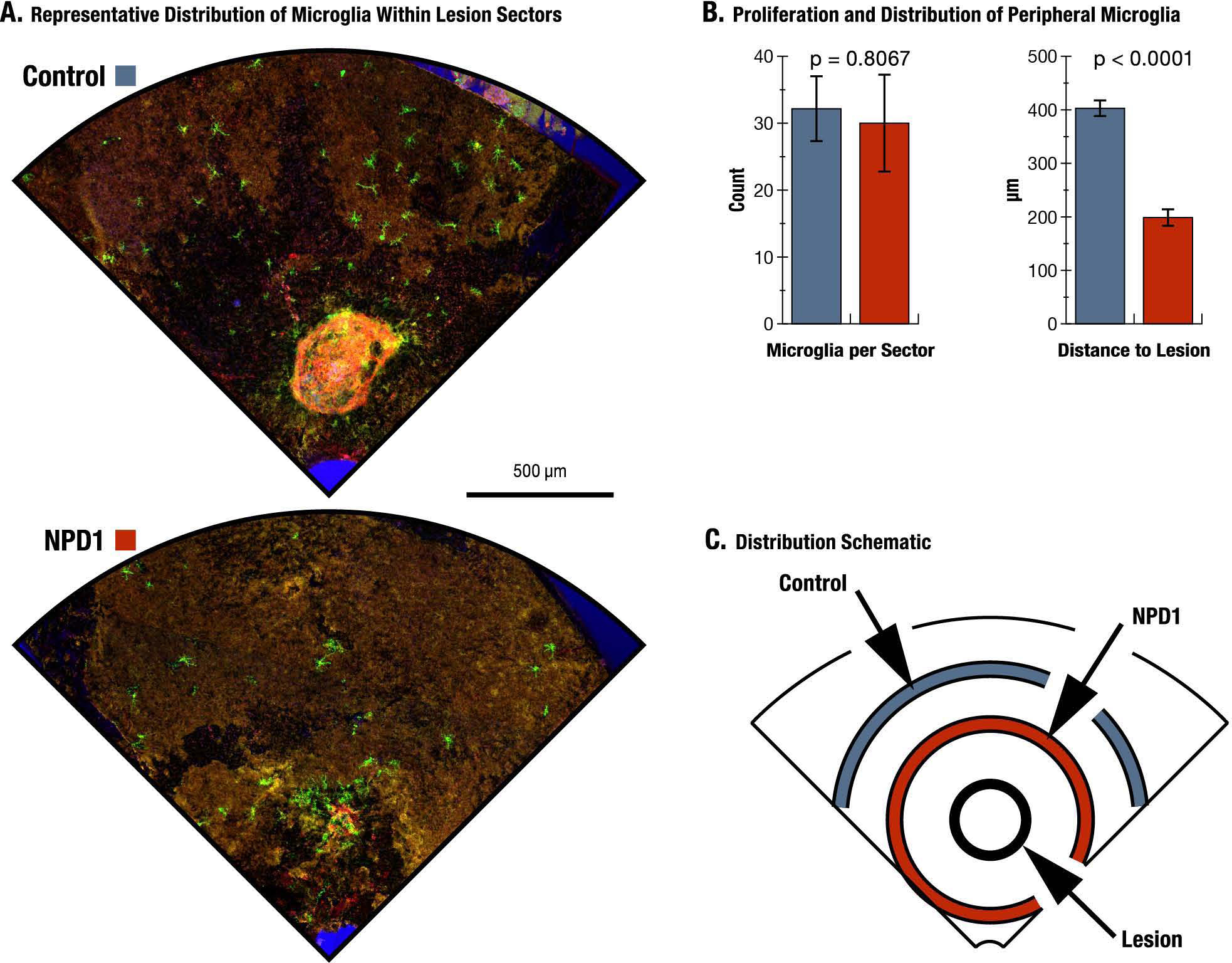 significantly different, with NPD1-treated microglia clustering 51% closer to the lesion perimeter than controls. The microglia