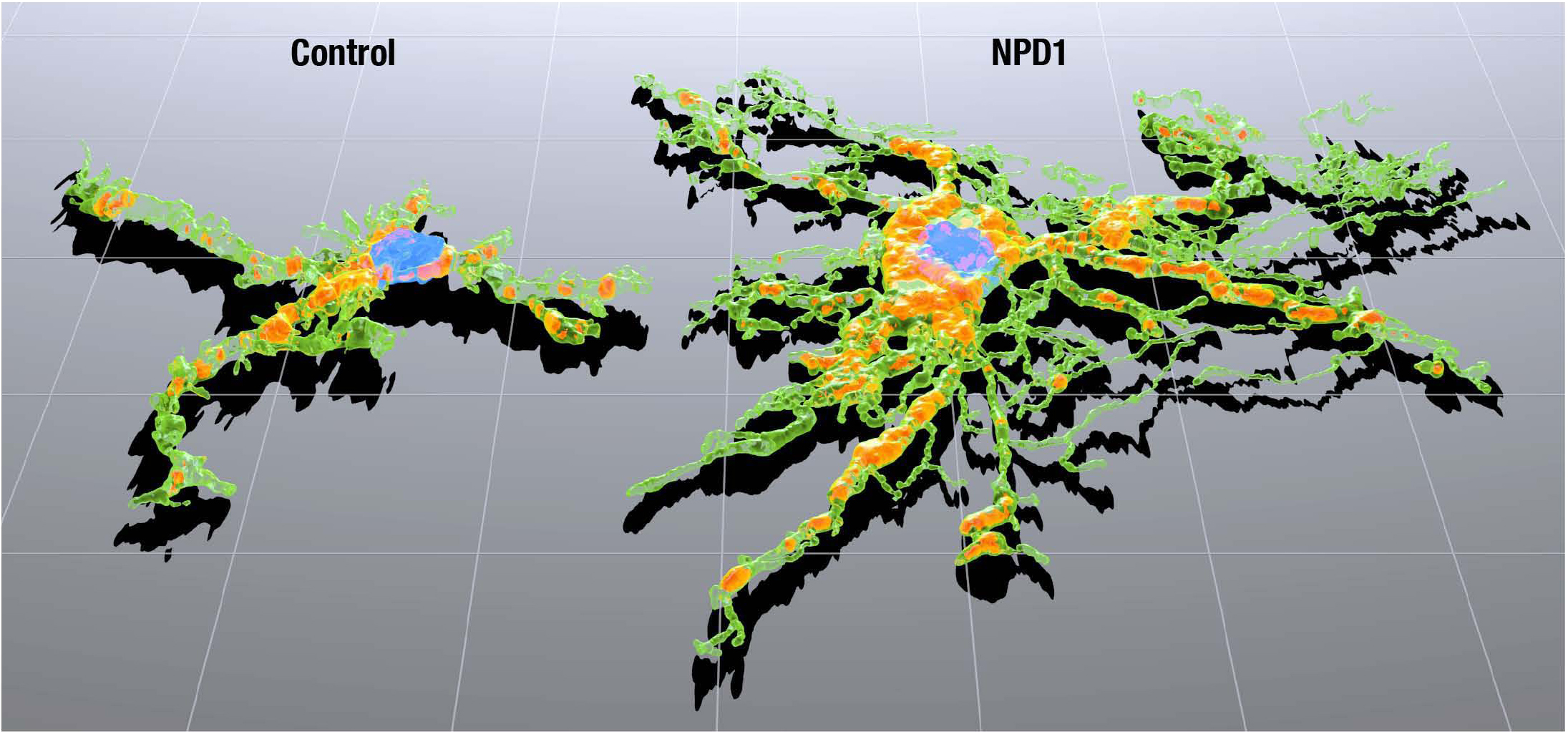 Figure 8. Comparison of representative microglia rendered in three dimensions. Microglia from control and neuroprotectin D1 (NPD1)-treated