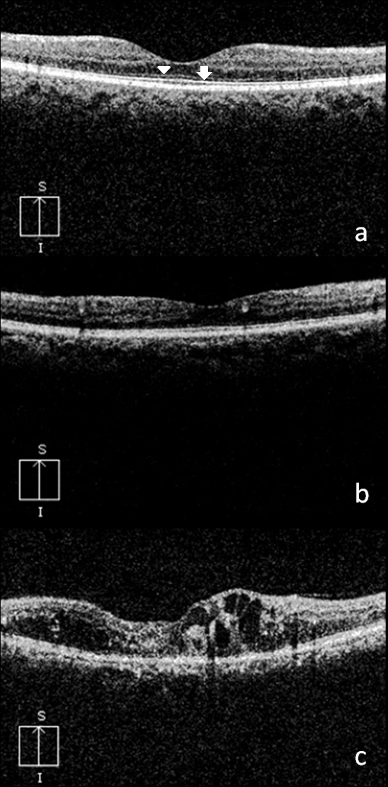 disruption respectively. A: grade 0—no disruption of ELM (arrowhead) and IS-OS junction (arrow); B: grade 1—ELM disrupted, IS-OS junction intact; C: grade 2—both ELM and IS-OS junction disrupted.