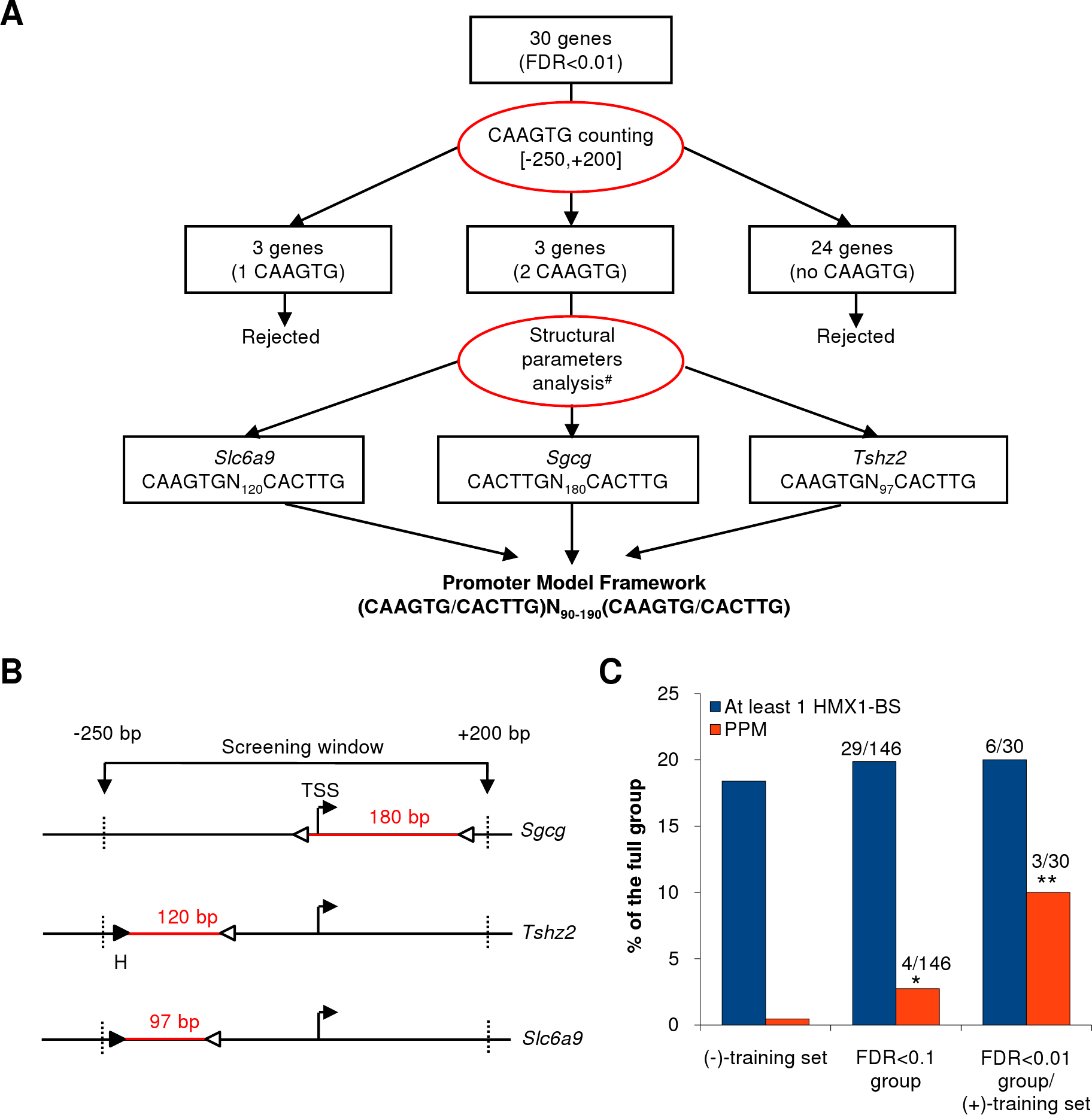 Figure 2. Elaboration and statistical validation of an Hmx1 predictive promoter model. A: Flowchart of the predictive promoter model (PPM) construction. #Location of CAAGTG motifs within proximal promoter or 5'UTR