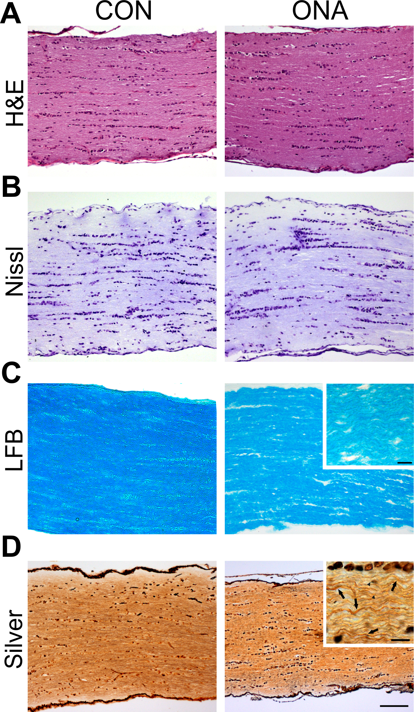 ONA nerves were more disorganized (n=8/group). C: Luxol fast blue (LFB) staining was applied to assess signs of demyelination (n=8/group). Particularly in the magnified image,