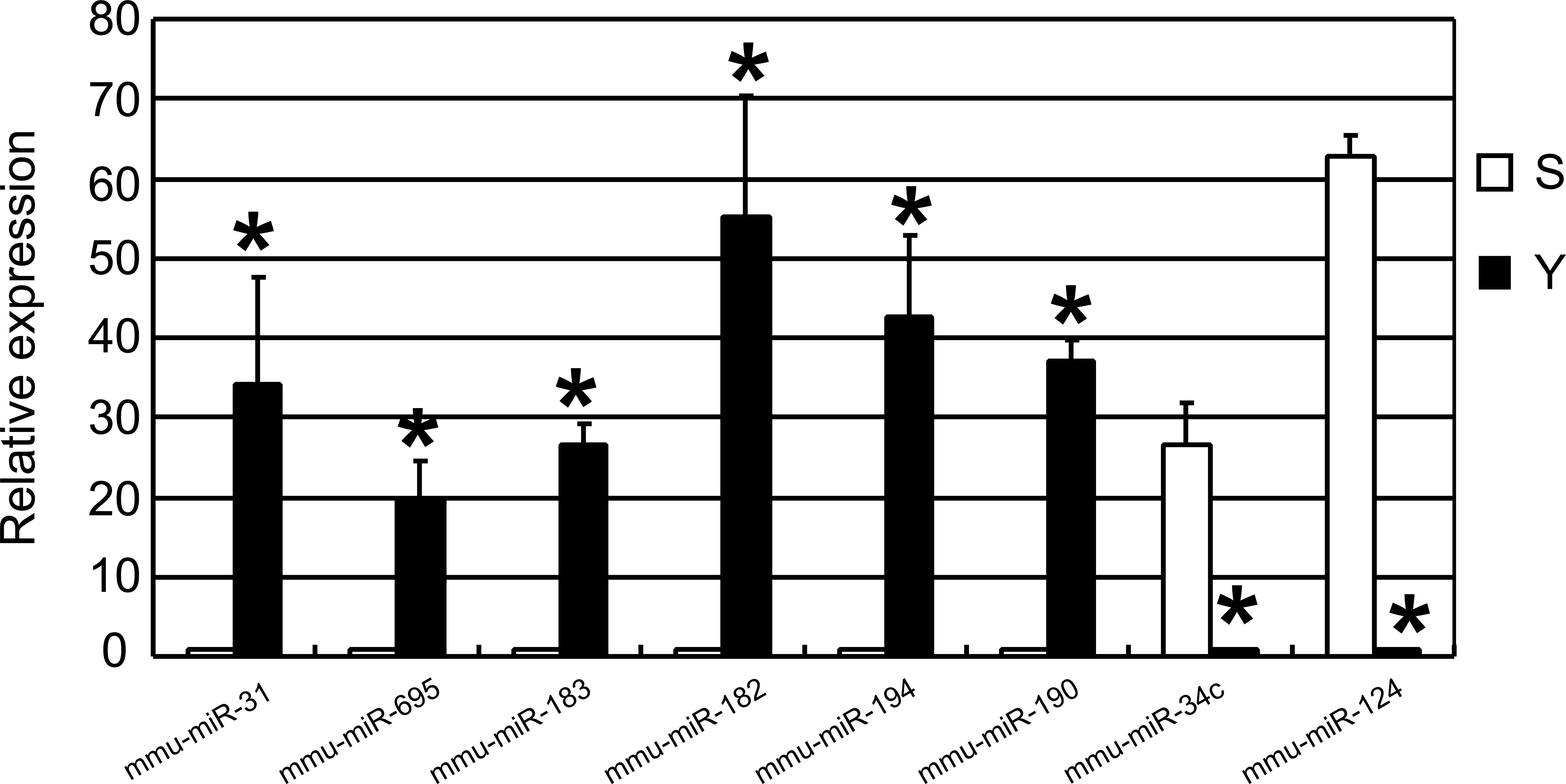 The results showed that the expression of mmu-miR-31, mmu-miR-695, mmu-miR-183, mmu-miR-182, mmu-miR-194, and mmu-miR-190