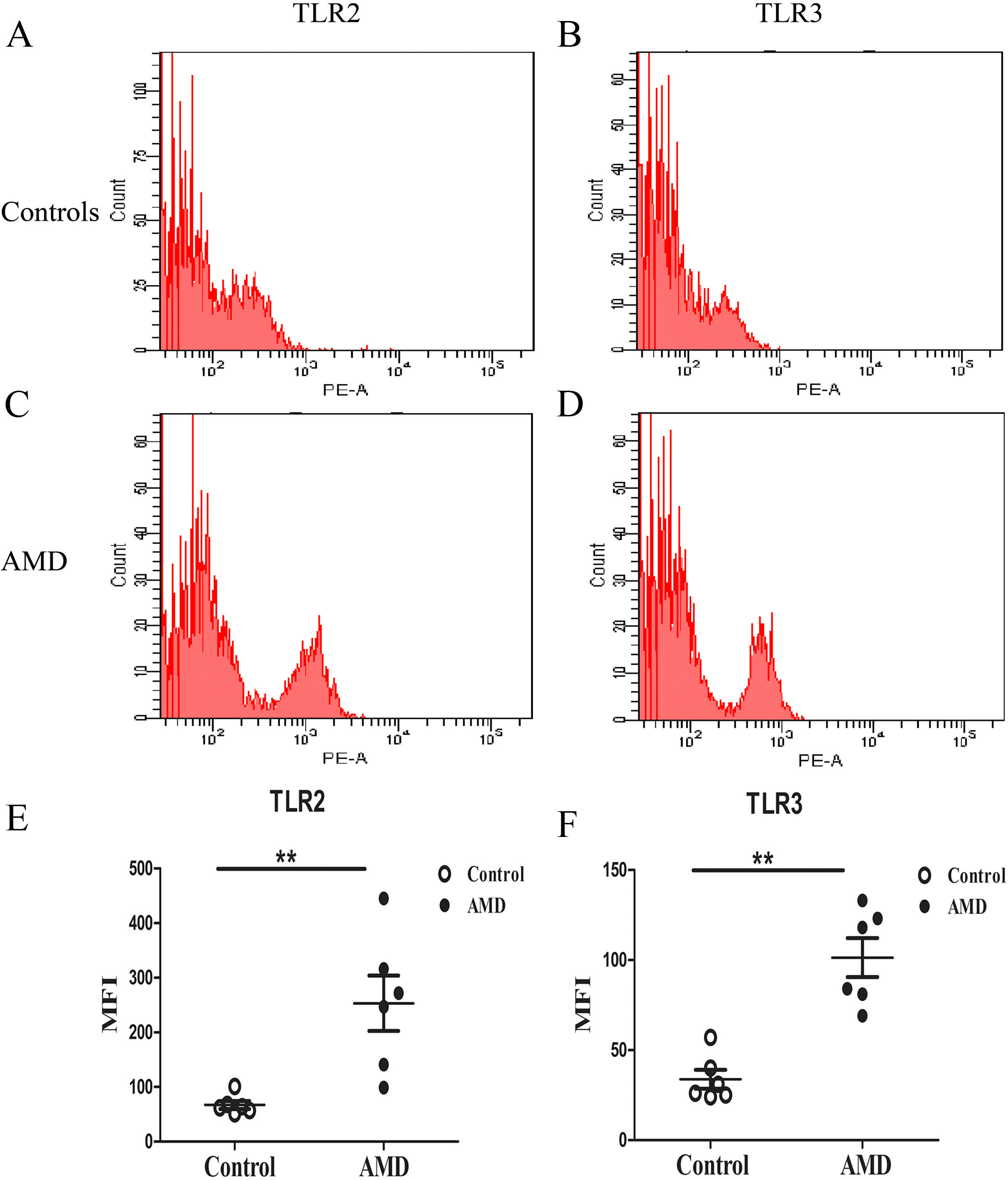 from patients (n=6; A, C) and healthy controls (n=6; B, D) measured with flow cytometer (FCM). Expressions of TLR2, TLR3 protein were higher in PBMCs of AMD group than in the control