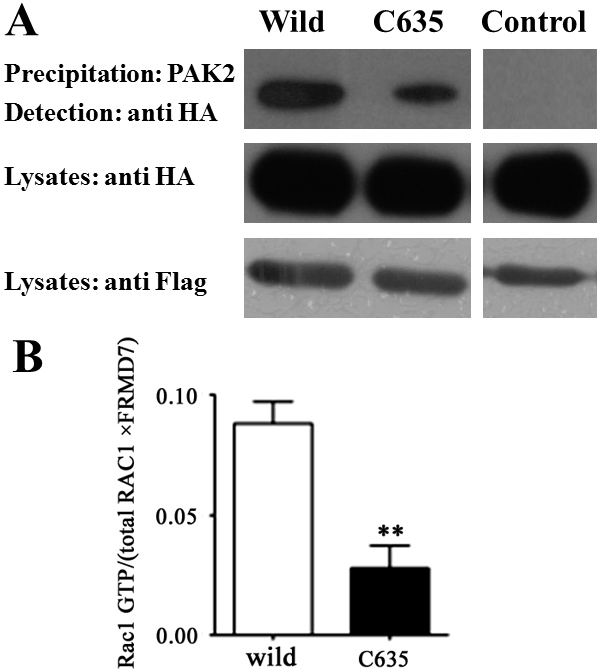 mutant-type FRMD7 contained decreased amounts of GTP-Rac1 compared with the wild-type (A). (Wild: wild-type FRMD7+Rac1; C635: mutant-type (c.635T>C) FRMD7+Rac1; Control: empty vector+Rac1). The experiments were