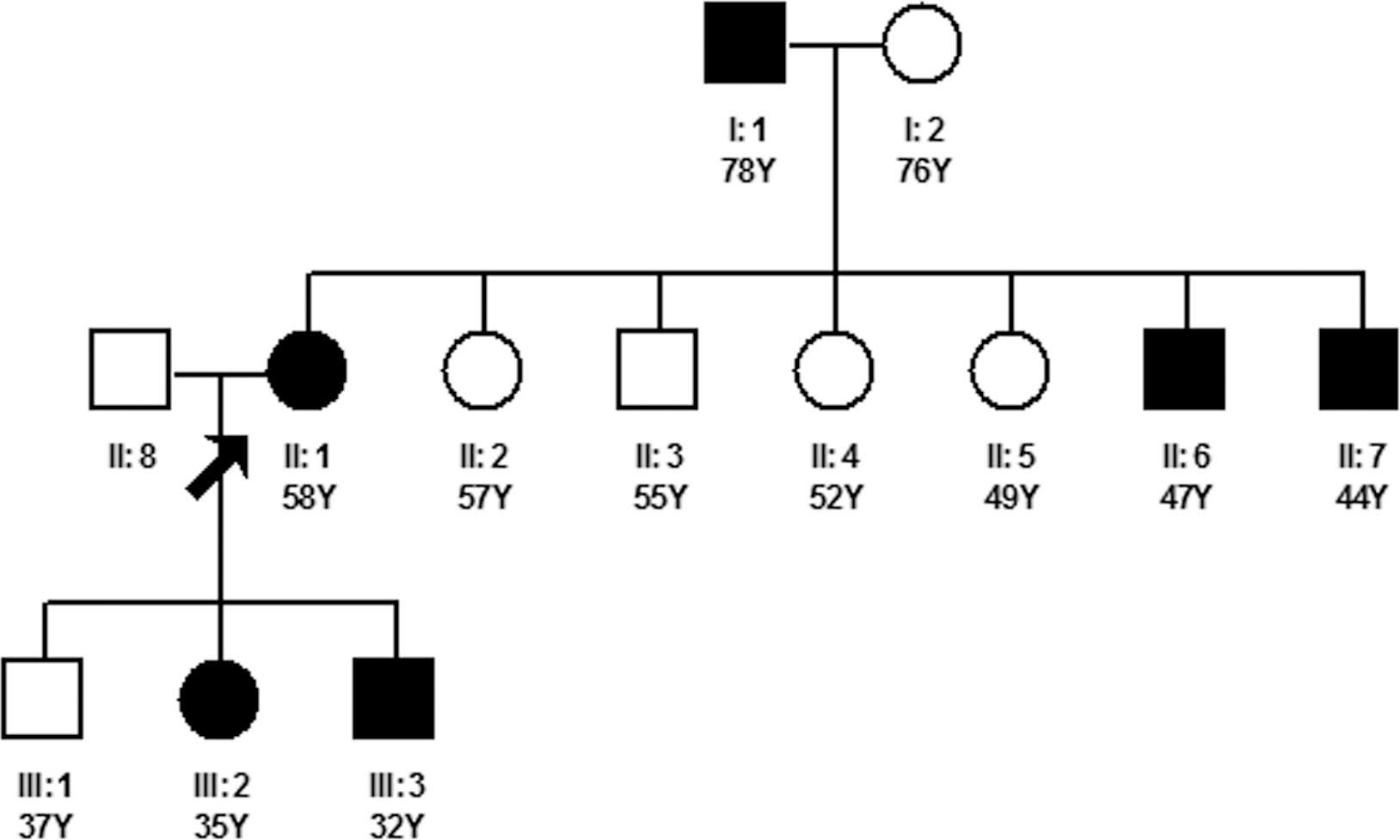 Figure 1. A typical pedigree in the case group. The proband, a 58-year-old female diagnosed with primary open angle glaucoma, had 11
