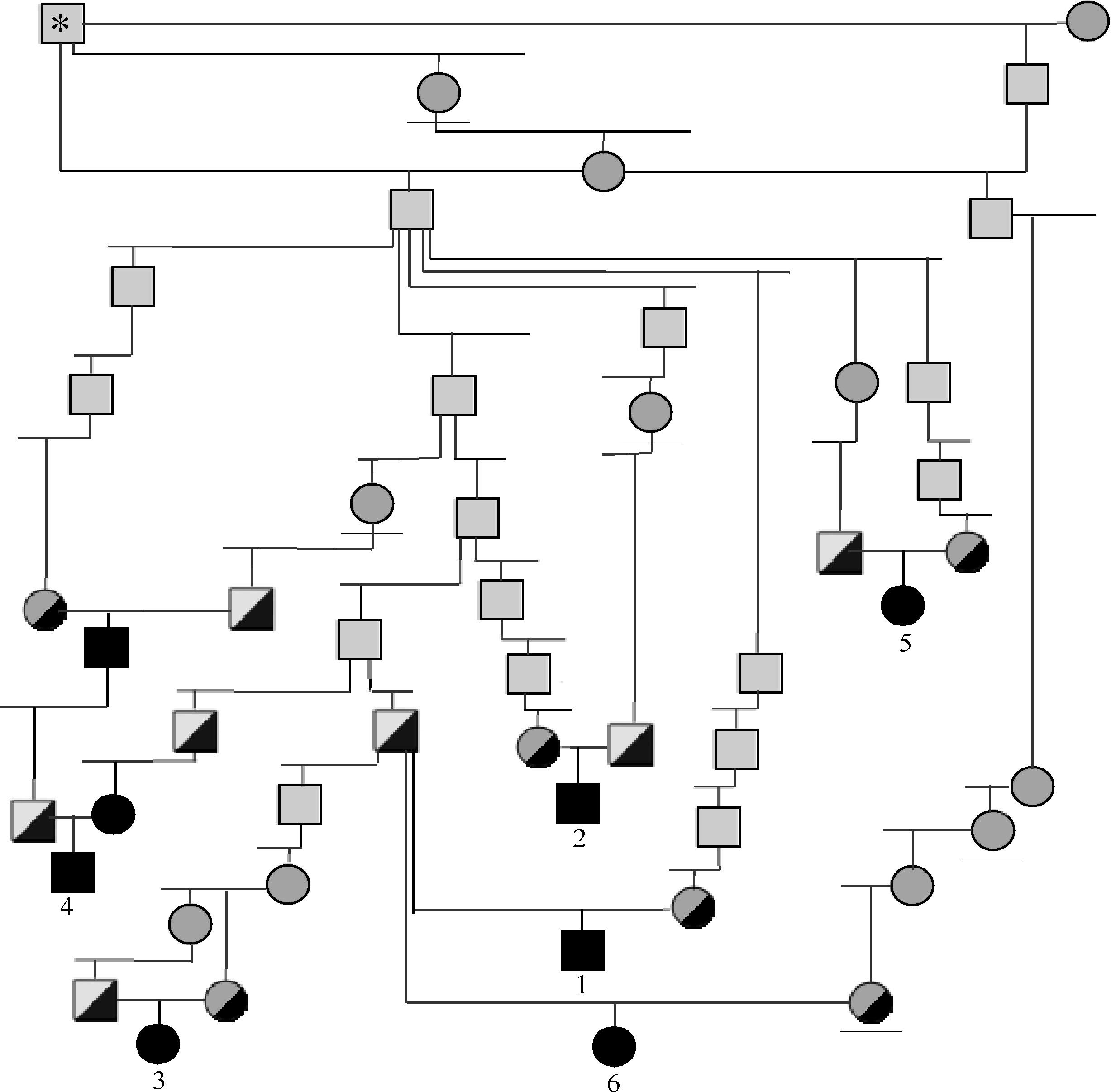 an asterisk is common to the maternal and paternal ancestral lines of all six affected dogs in this pedigree. Not all ancestors
