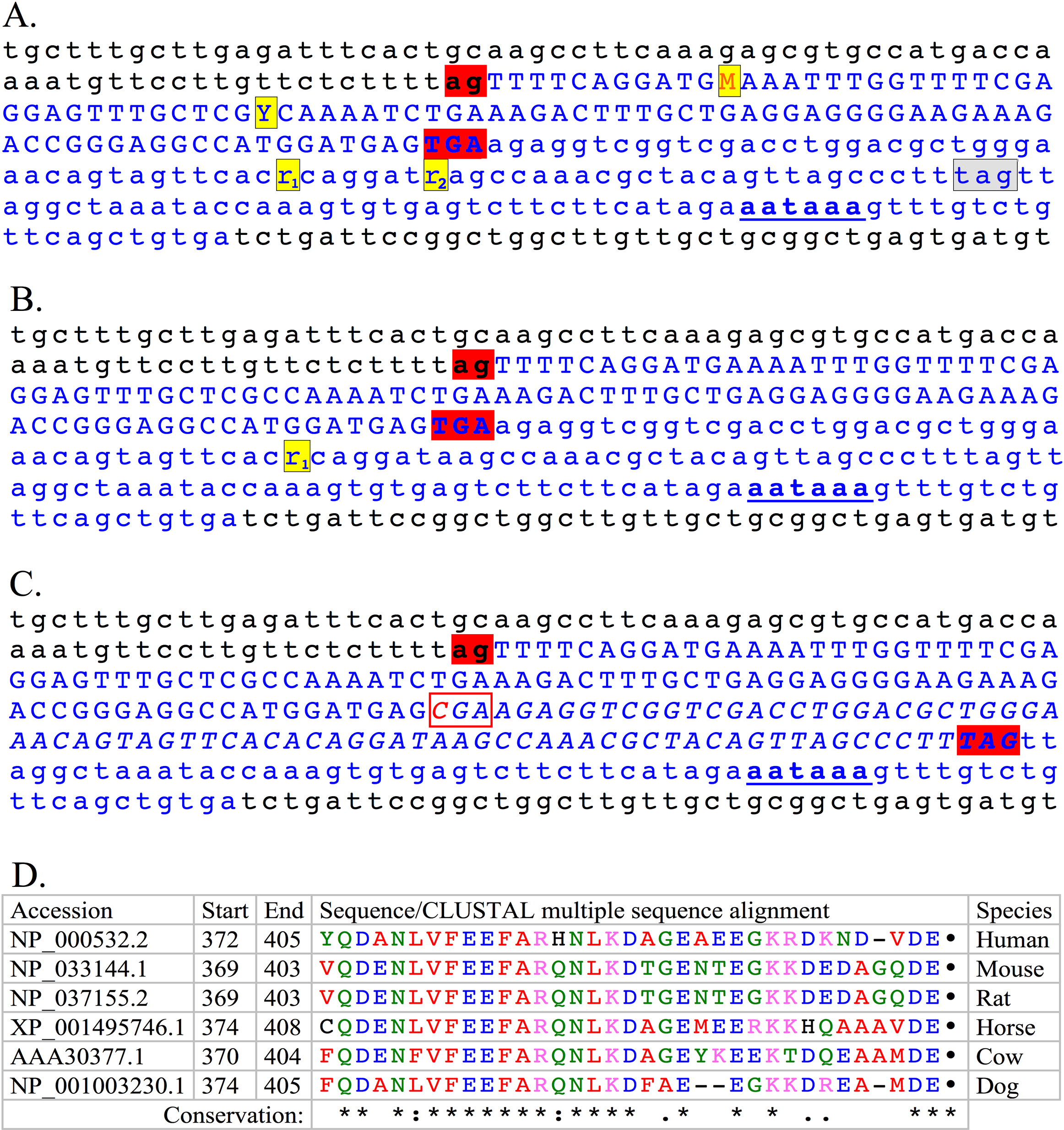 TGA highlighted in red and bolded. M=C or A, Y=C or T, indicate observed canine SNPs. Blue lowercase is the 3′ untranslated region