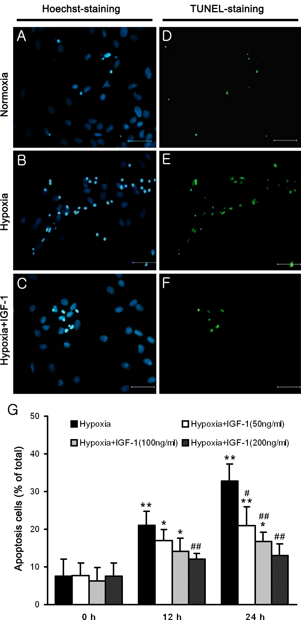 Figure 2. IGF-1 protects primary cultured retinal ganglion cells from hypoxia-induced apoptosis. A–C: Nuclear morphology is indicated by Hoechst 33342 staining, and (D–F) DNA breaks were detected by TUNEL analyses. A, D: Primary cultured retinal ganglion cells (RGCs) were grown with normoxia for control, (B, E) cells were subjected to hypoxia for 24 h, and (C, F) cells were incubated with 200 ng/ml IGF-1 and subjected to hypoxia. The scale bar represents 50 μm. G: Percentage of apoptotic cells at different time points. Primary cultured RGCs were grown with normoxia or hypoxia. The hypoxia