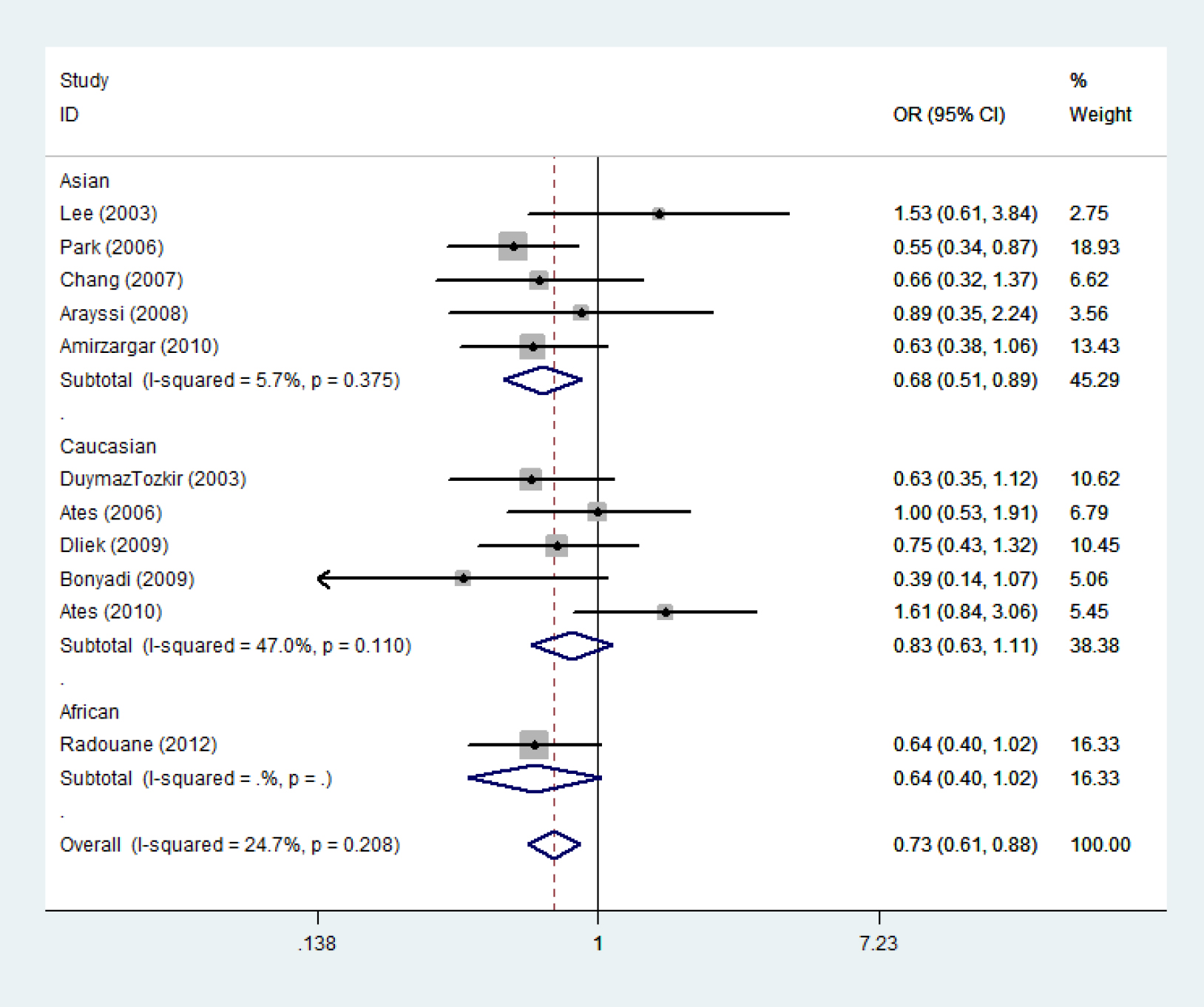 Odds ratios and 95% confidence intervals for individual studies and pooled data for the association between the A versus G allele of the tumor necrosis factor −308A/G polymorphism and Behcet’s disease.