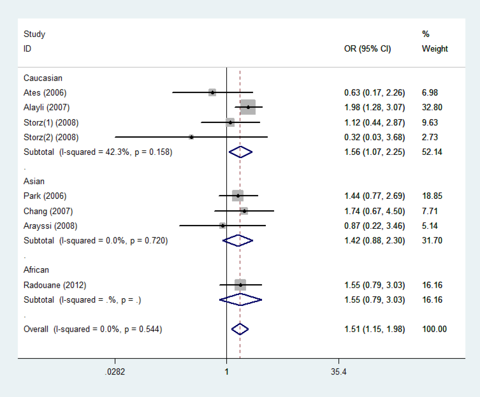 Odds ratios and 95% confidence intervals for individual studies and pooled data for the association between the A versus G allele of the tumor necrosis factor −238A/G polymorphism and Behcet’s disease.