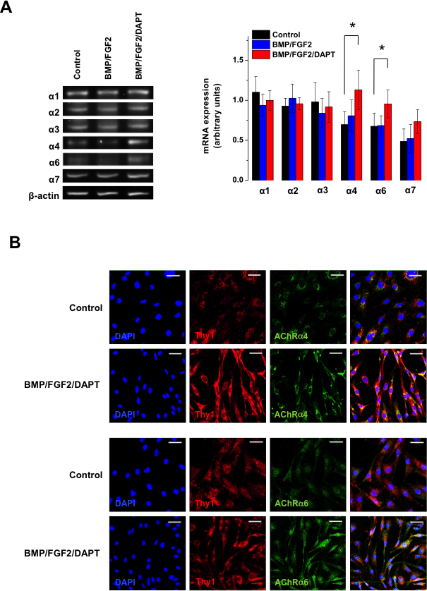 with BMP and FGF2 alone (blue bars), as shown by reverse transcription PCR (RT-PCR; *p<0.05, n=6, right panel). B: Immunohistochemical staining showed an increase in protein expression of the α4 and α6 nicotinic AChR subunits (green) with