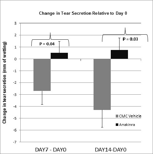 0) changes in tear secretion were −2.7±1.1 (carboxymethylcellulose [CMC] vehicle) versus 0.49±0.20 (anakinra), p=0.04; where