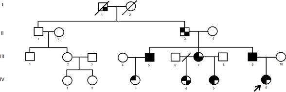 Figure 1. The pedigree of the family is shown. The squares indicate men, and the circles indicate women. Filled quadrants indicate phenotype