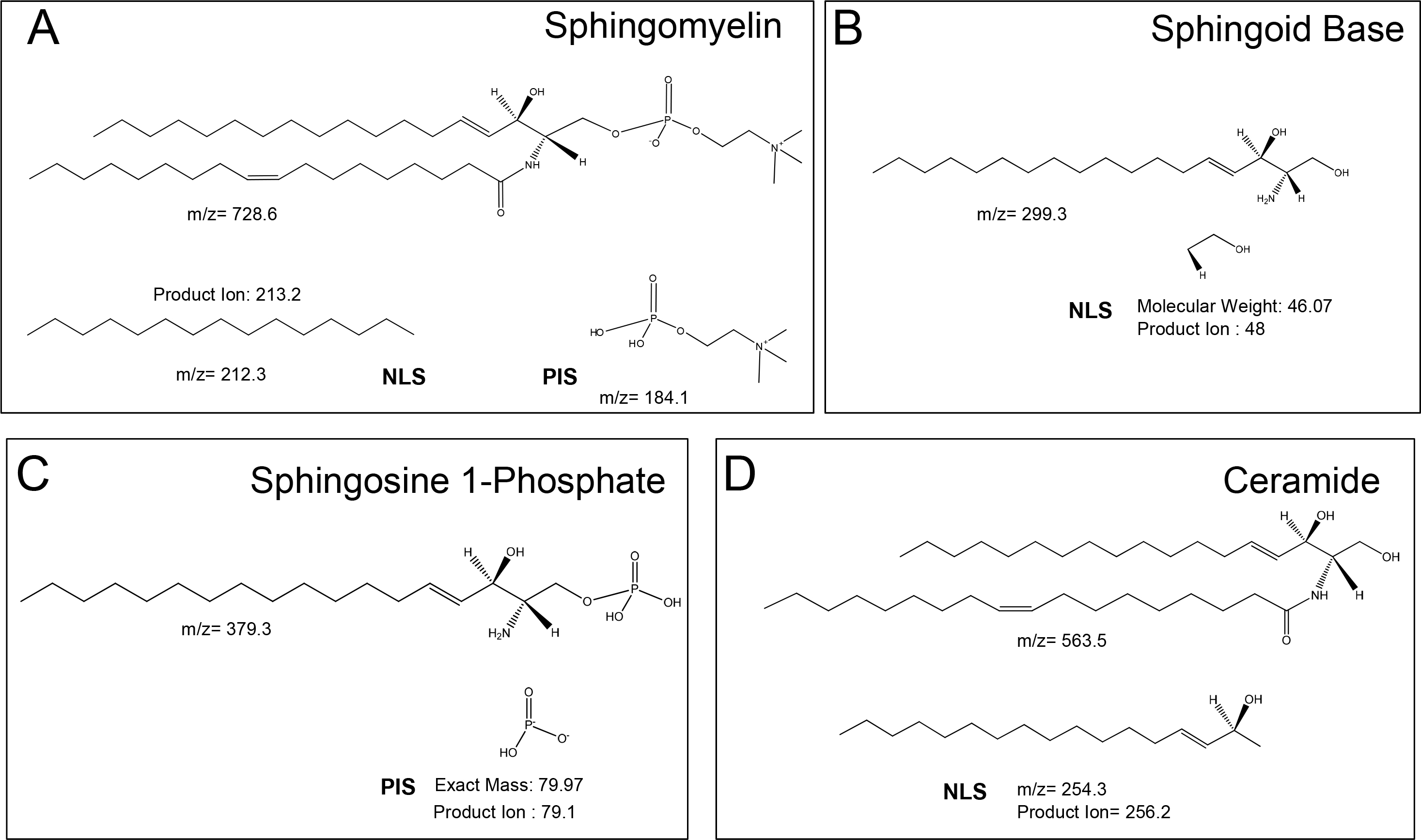 Figure 2. Schematic diagram of sphingolipids and ceramides showing precursor and product ions. A: This panel illustrates the structure of sphingomyelin standard with an m/z ratio of 728.6; the product ions can be generated