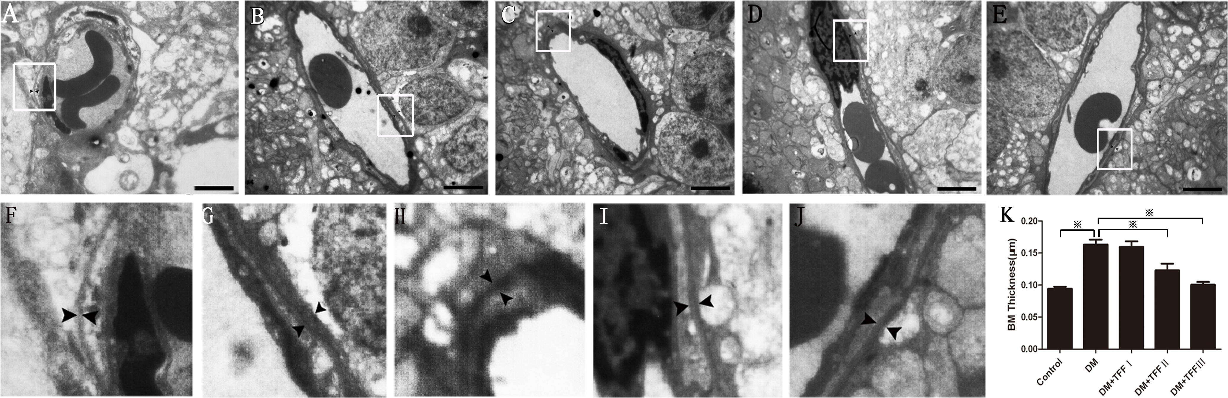 n=4 per group. Eight electrophotographs of each group were analyzed. A–E: The electron micrograph images were representatives the transverse sections of retinal capillaries of the control (A), DM (B), 50 mg/kg TFF-treated (C), 100 mg/kg TFF-treated (D) and 200 mg/kg TFF-treated (E) group (Scale bar=4 μm). F-J:The enlarged views of A-E were showed. K: The BM thicknesses of retinal capillaries in different group were measured.. Data are expressed as mean ±standard deviation;