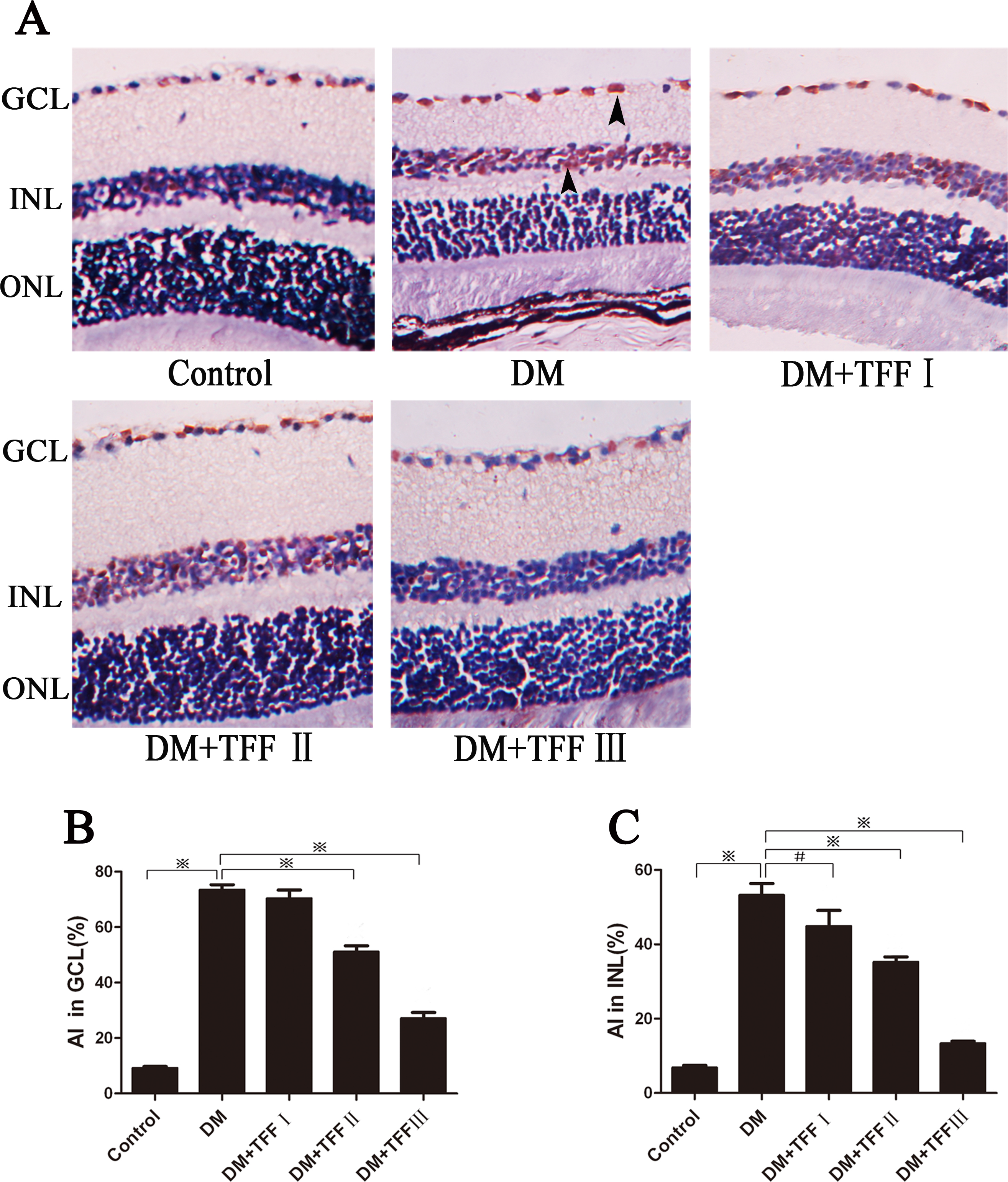 analyzed. AI: apoptotic index; GCL: ganglion cell layer; INL: inner nuclear layer; Black arrows indicated TUNEL-positive cell.