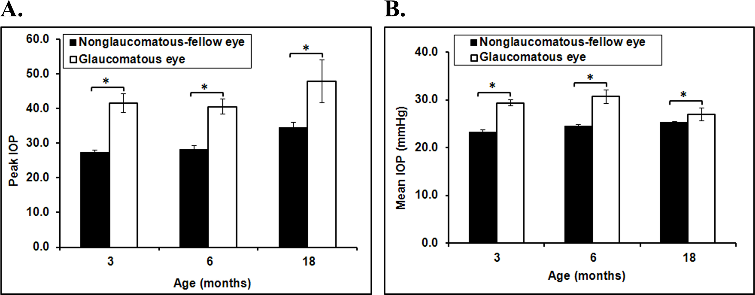 was no significant difference in mean or peak IOP between young and old rats. Data presented as SEM, n=8, *=p<0.05.