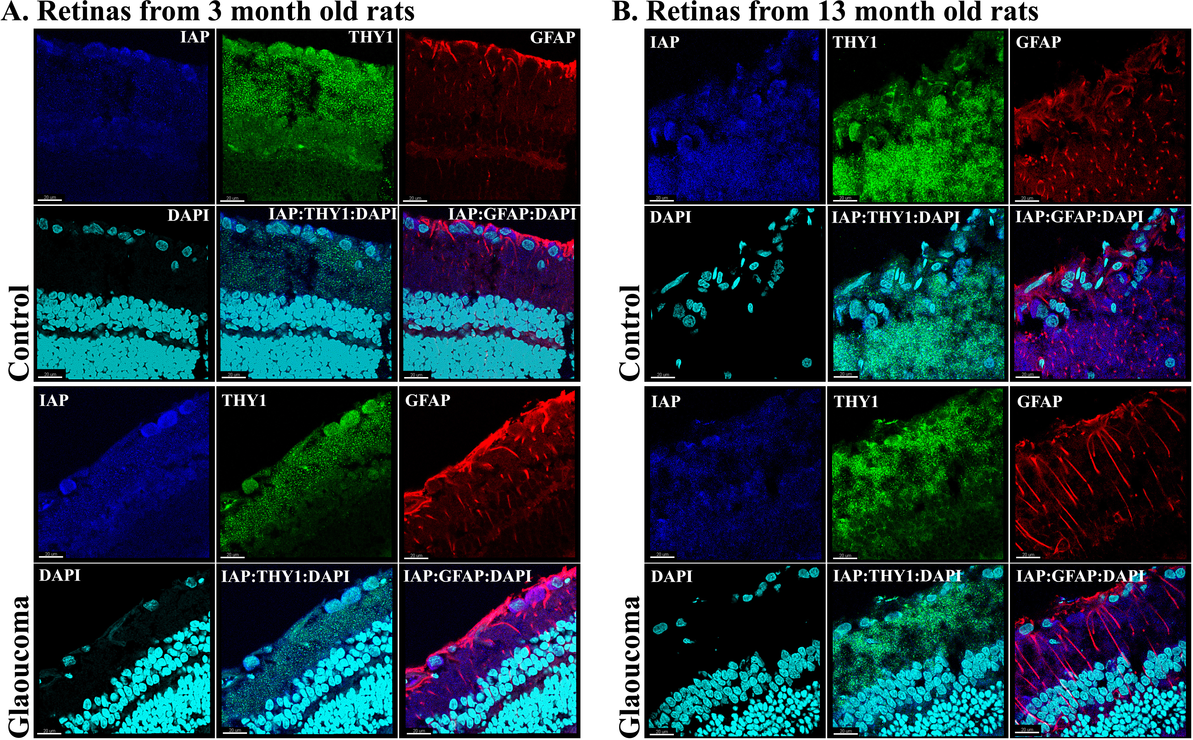 A: In 3-months-old rats, IAP levels increased in glaucomatous eyes as well as staining for GFAP. B: IAP-1 staining decreased in old glaucomatous 13-month-old eyes as compared to fellow eyes. Magnification 40X, scale bars: