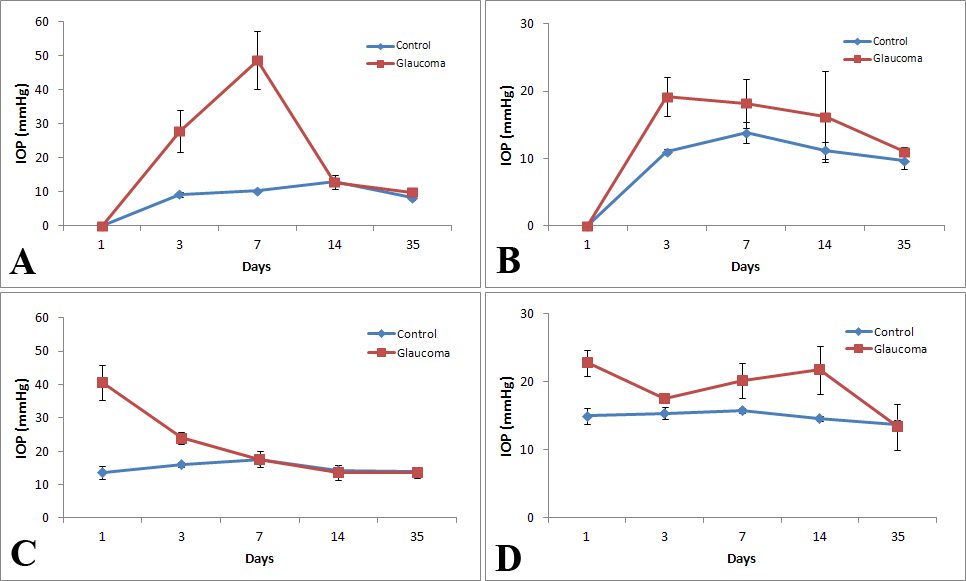 the control eye and glaucoma treated eyes at five different time points post bead injection are shown in the panels as follows: