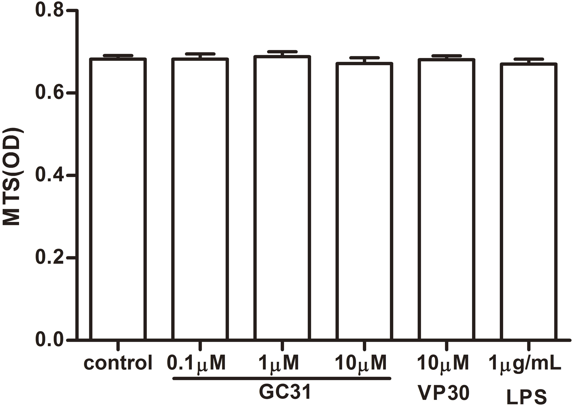 cells (HUVECs) were incubated with GC31 (0.1, 1, and 10 μM), VP30 (10 μM), or LPS (1 μg/ml) for 24 h. The percentages of viable