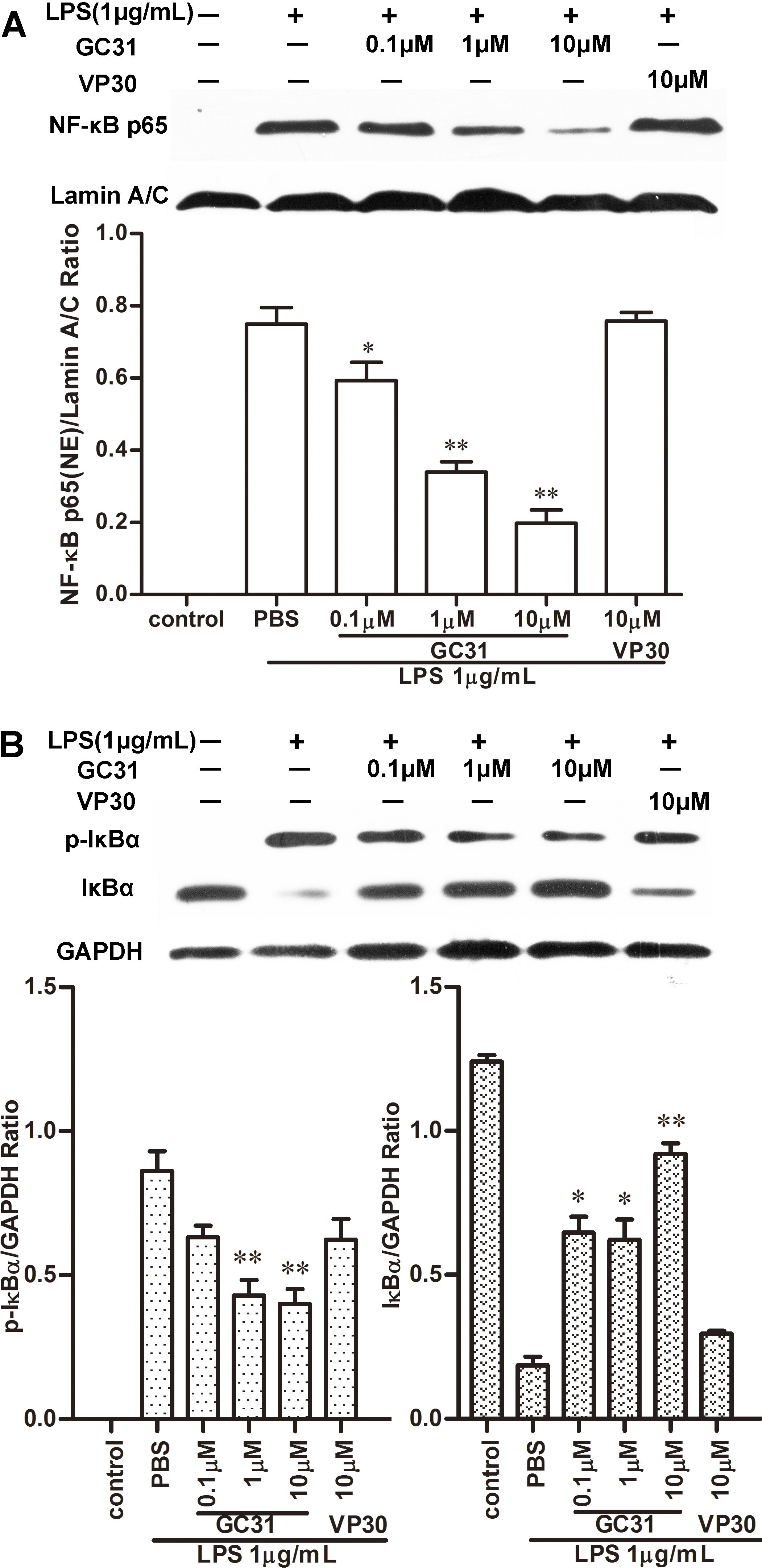 nuclear translocation in human umbilical vein endothelial cells (HUVECs). A: Cells were preincubated with GC31 or VP30 for 30 min and then with 1 μg/mL lipopolysaccharide for 1 h. Nuclear extracts
