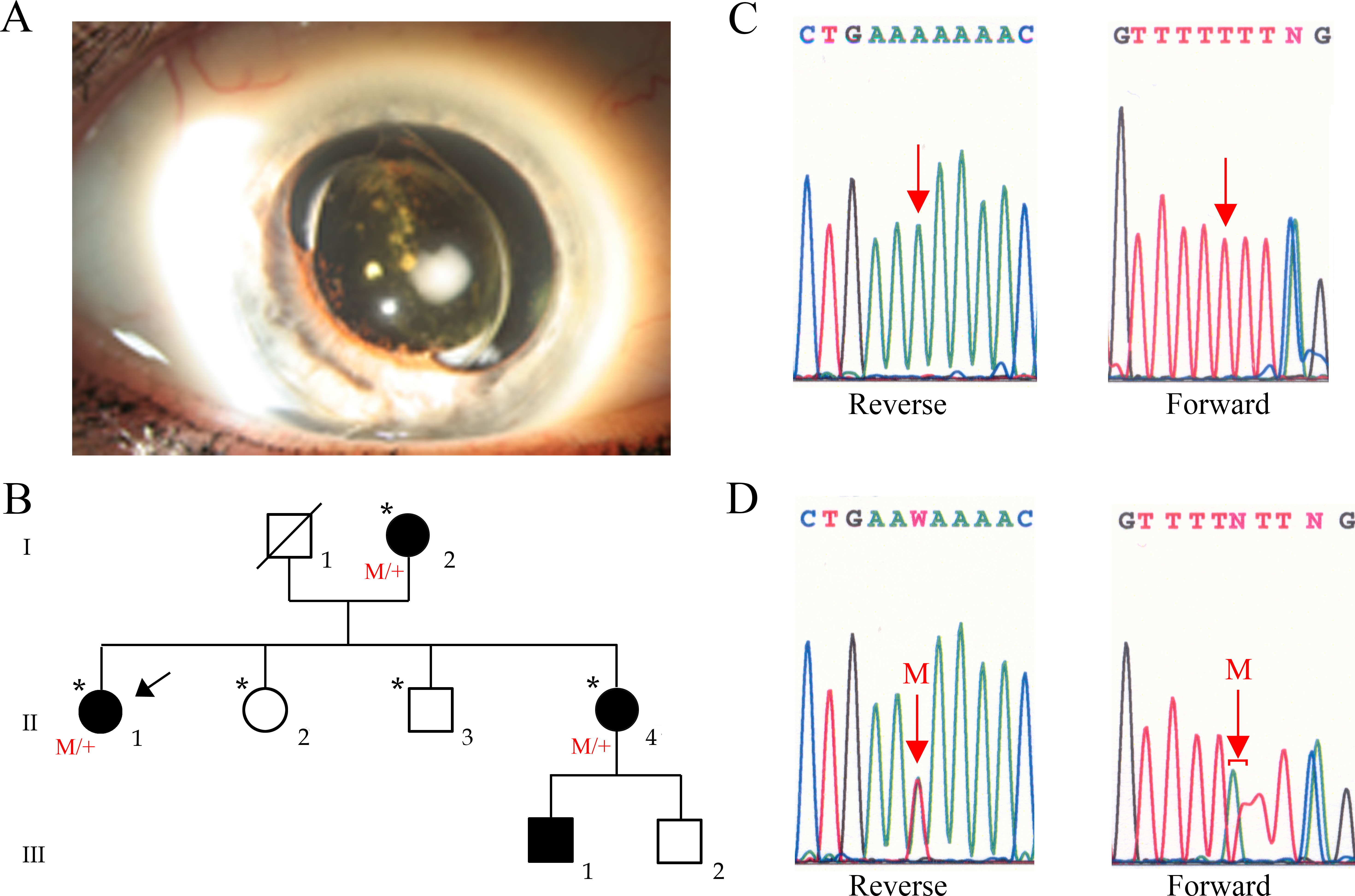 Figure 1. Ophthalmic and genetic analysis of a family with Wagner syndrome. A: Anterior segment photograph of the proband’s right eye (individual II:1) showing the synechiae between the intraocular lens