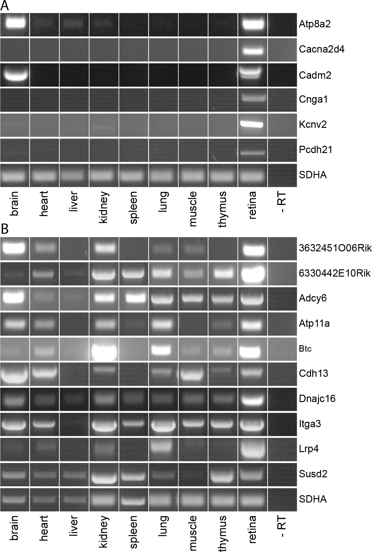 Atp8a2, Cacna2d4, Cadm2, Cnga1, Kcnv2 and Pcdh21 are expressed prominently in the retina and only a few additional tissues