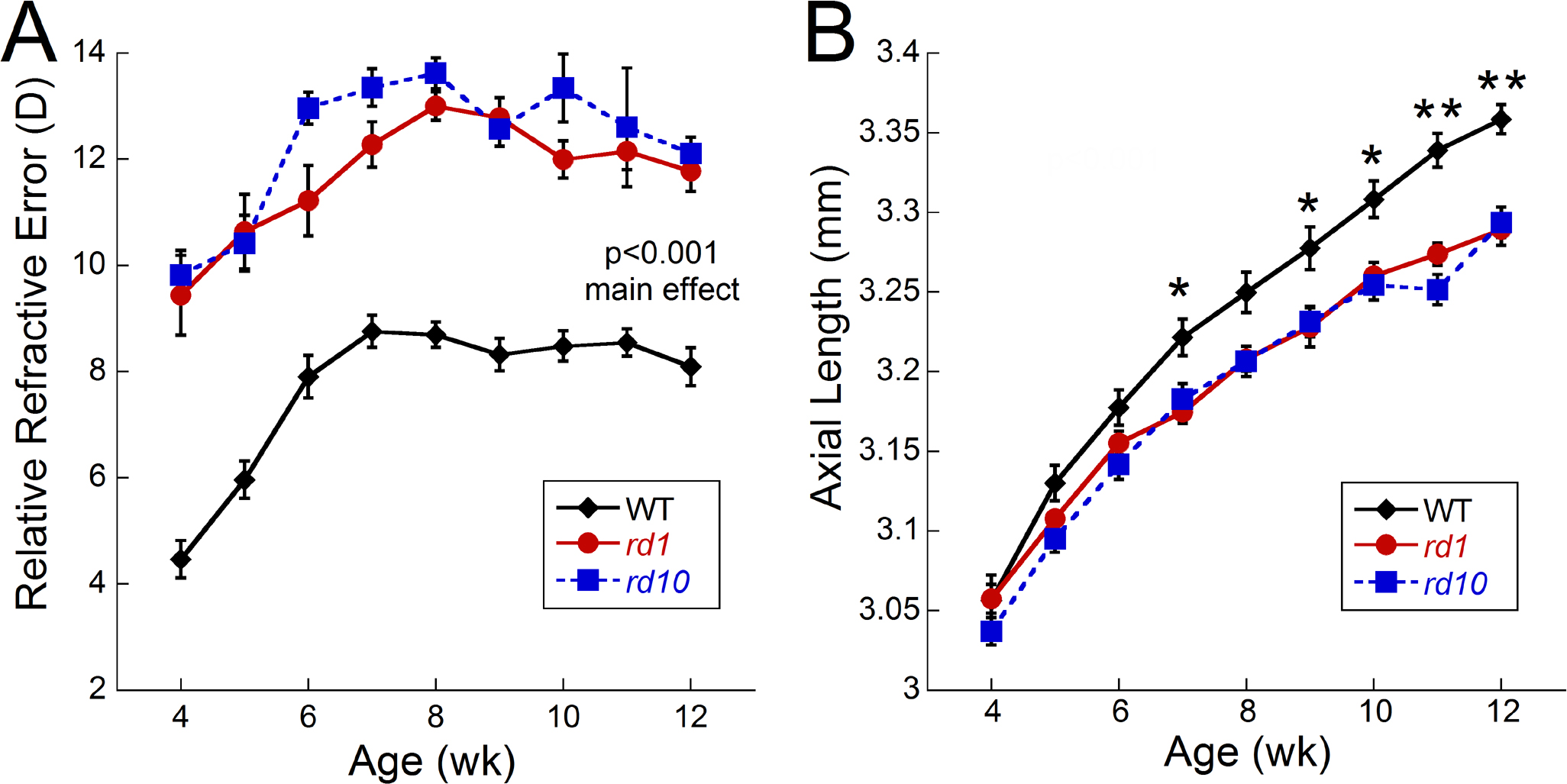 analysis of variance [RM-ANOVA], main effect of treatment, F(2,501)=76.3, p<0.001). No statistical differences were found between rd1 and rd10 mice (WT, n=29; rd1, n=17; rd10, n=13). B: Axial length measurements were significantly shorter by 7 weeks of age in rd1 and rd10 mice compared to WT (RM-ANOVA F(16, 252)=6.95, p<0.001; WT, n=11; rd1, n=11; rd10, n=10). Data are expressed as mean±standard error of the mean (SEM). Post-hoc analysis: *p<0.02; **p<0.001.