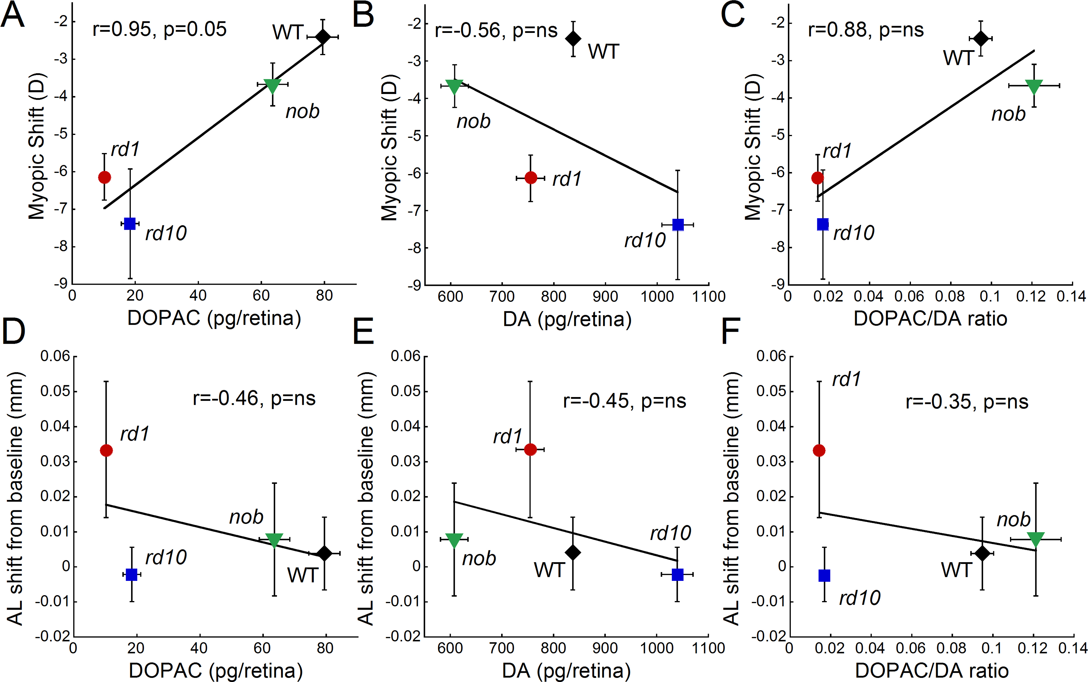 F) for each strain. Myopic shift was most strongly correlated with DOPAC levels across strains (Pearson’s correlation r=0.94,