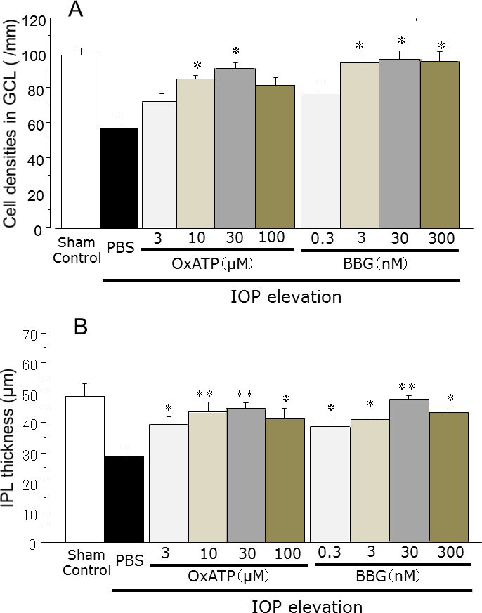 Figure 2. Effects of the P2X7 antagonists—oxidized adenosine triphosphate (3–100 µM) and brilliant blue G (0.3–300 nM)—on the retinal changes after IOP