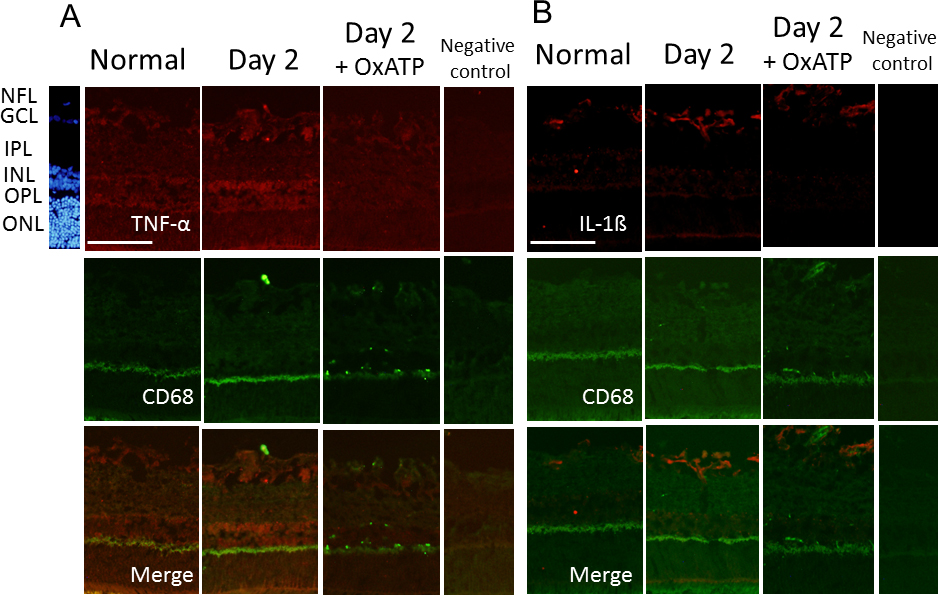 and the retina on day 2, with and without treatment of oxidized adenosine triphosphate (OxATP) at 30 µM just after intraocular