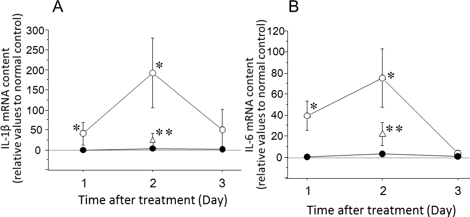 (closed circles). B: Alterations in IL-6 mRNA content in the retina after IOP elevation (open circles) or the sham treatment (closed circles).