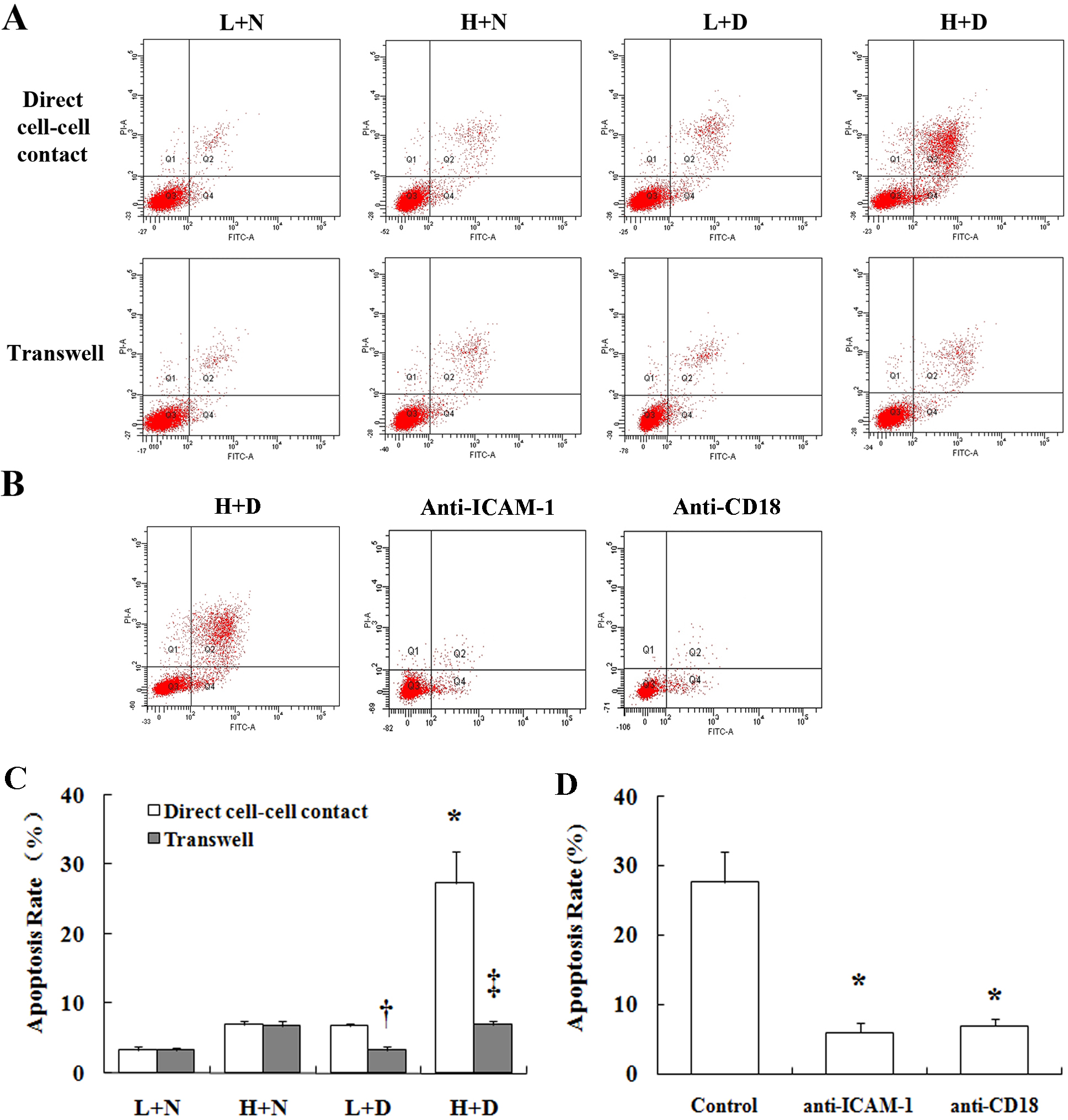 group (p<0.05), and ‡ indicates significantly less apoptosis in the transwell system versus direct cell–cell contact in the H+D group (p<0.05).