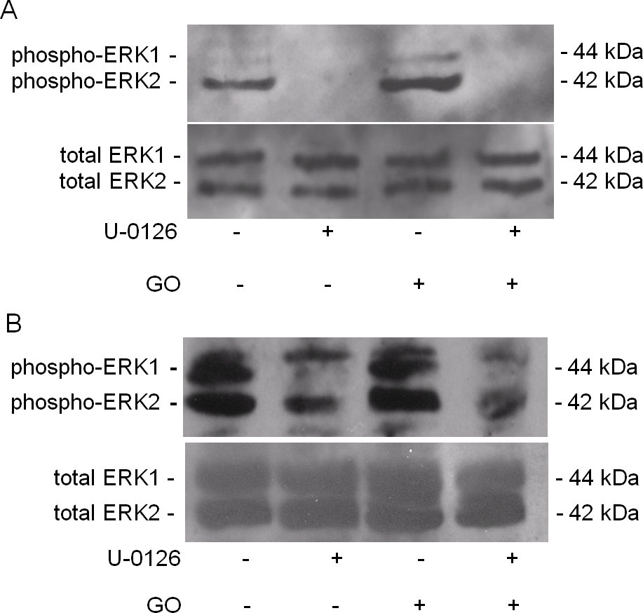 kinase 1/2 (ERK1/2) expression (upper panel) and total ERK1/2 (lower panel) in (A) lens epithelial cells (LECs) and (B) retinal pigment epithelial (RPE) cells treated with 0.25 mU/ml glucose oxidase in the presence or absence of 10 μM U-0126