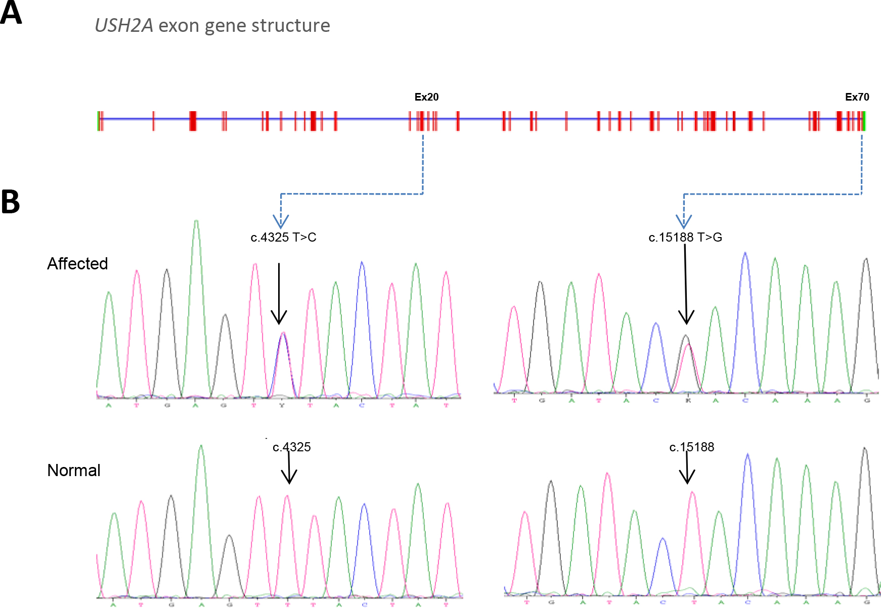Figure 2. The USH2A gene harbors mutations in exons 20 and 70 of subjects with autosomal recessive retinitis pigmentosa. A: The USH2A gene structure is composed of 72 exons. B: Chromatograms of normal USH2A DNA sequence and subjects with autosomal recessive retinitis pigmentosa (arRP) show mutations at the c.4325 and c.15188 nucleotide