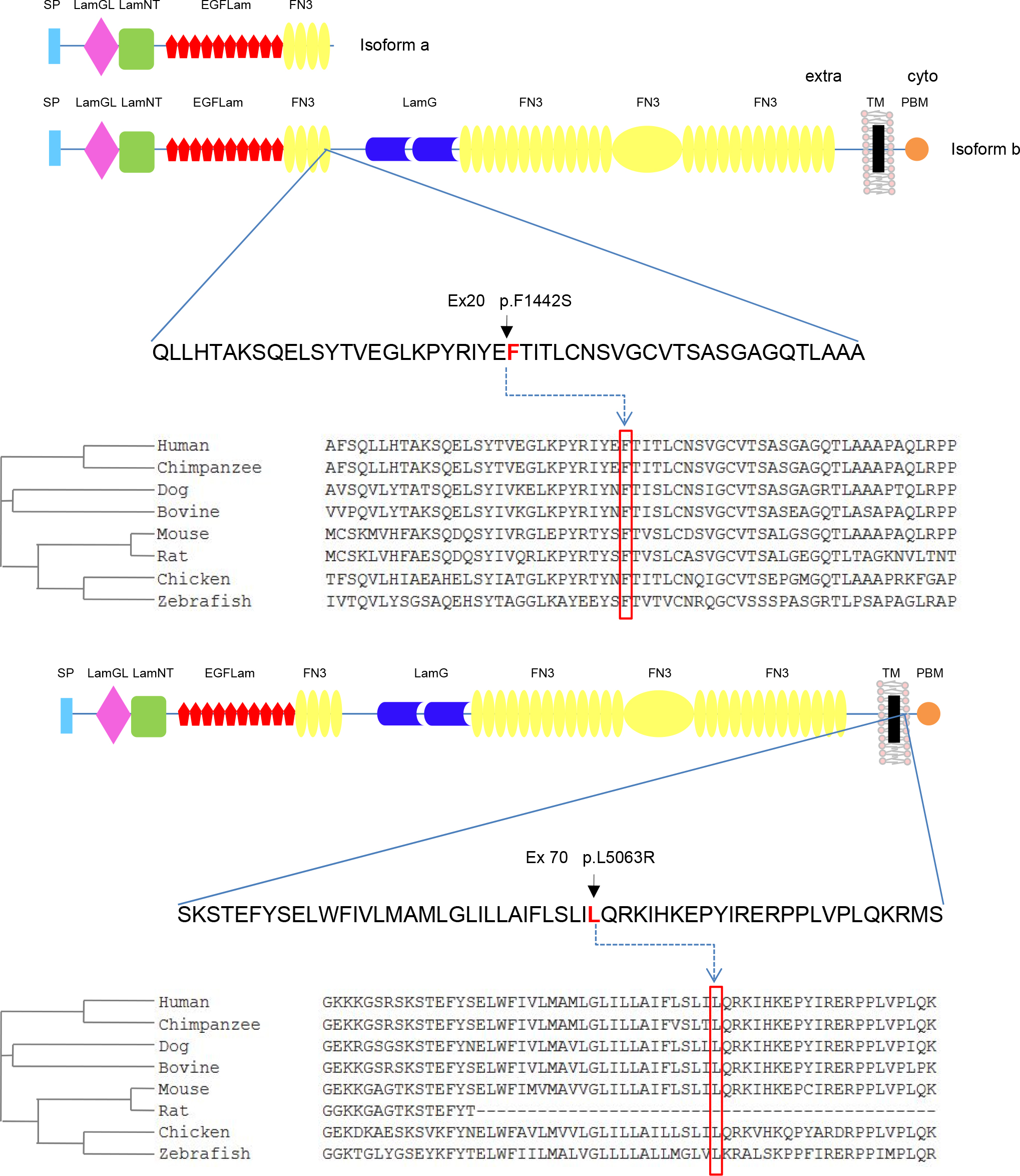 the fourth fibronectin domain type III common for both isoforms, while the L5063R variant locates in the C-terminal transmembrane